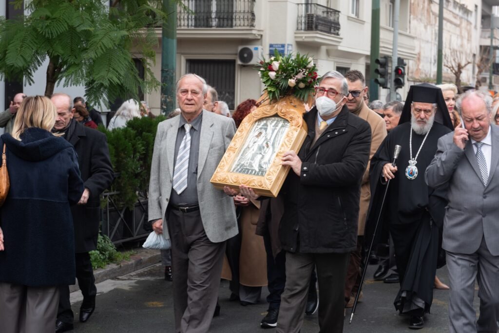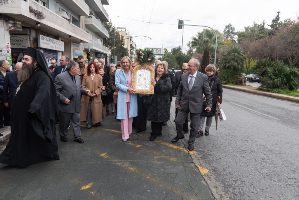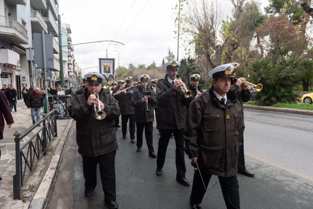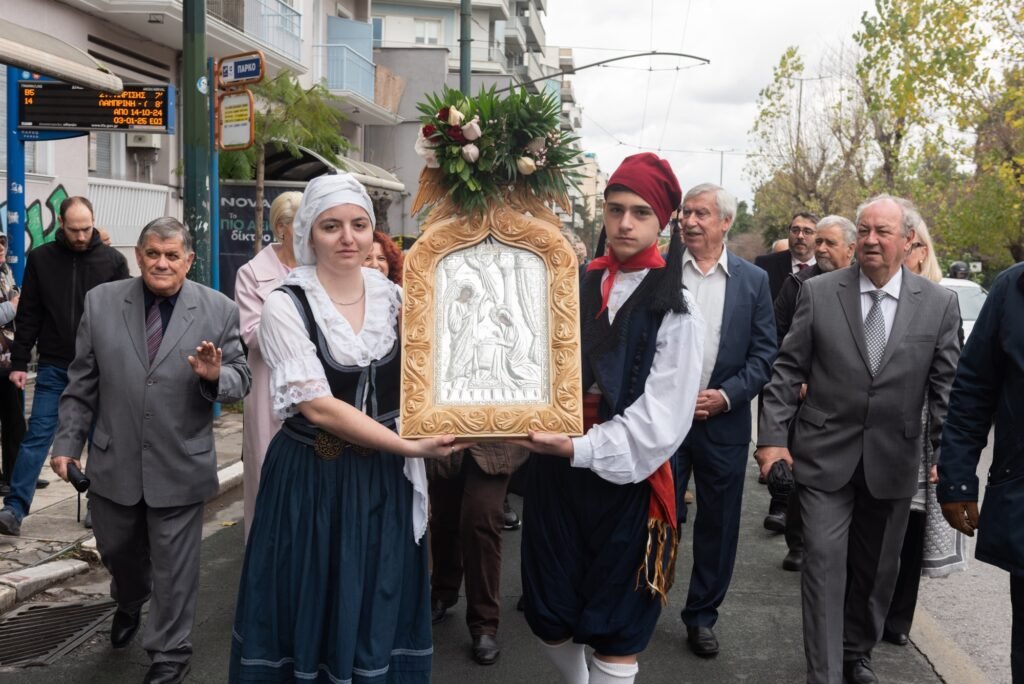 Ακολούθως, με τη συνοδεία της Φιλαρμονικής του Λιμενικού Σώματος και του Χορευτικού Τμήματος του Συλλόγου Μαρλά – Μαμάδουμε παραδοσιακές φορεσιές, έγινε η μεταφορά της Εικόνας,  μέσω της Λ. Αλεξάνδρας, στο κτήριο της Αδελφότητας. Ο Πρόεδρος του ΔΣ κ. Εμμανουήλ Σκαρής καλωσόρισε τους παρευρισκόμενους και αναφέρθηκε συνοπτικά στη σημασία της εορτής.