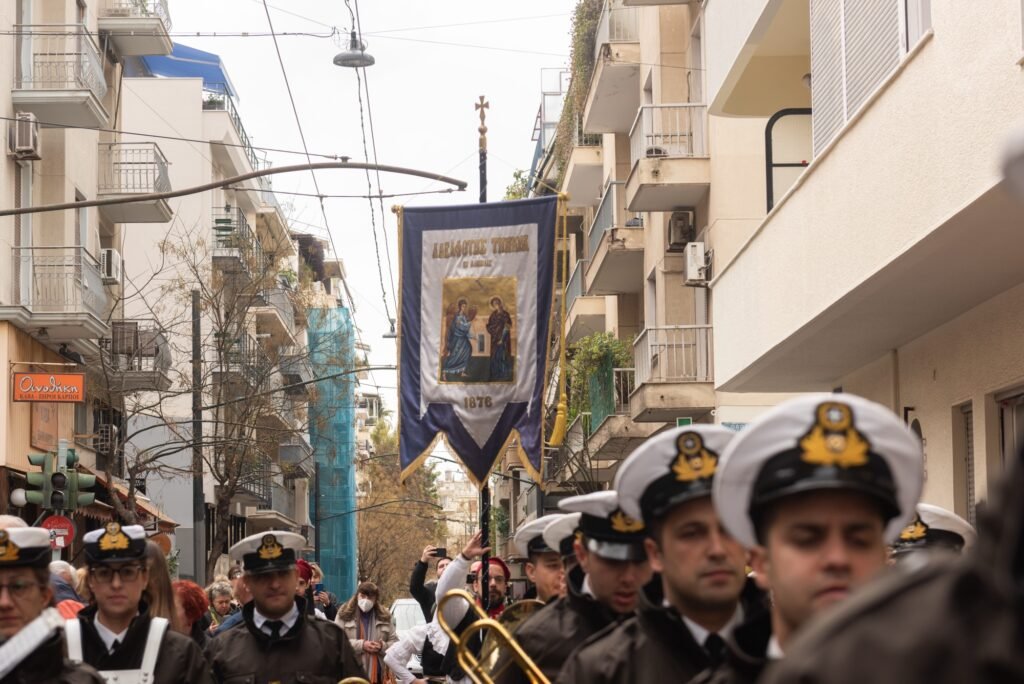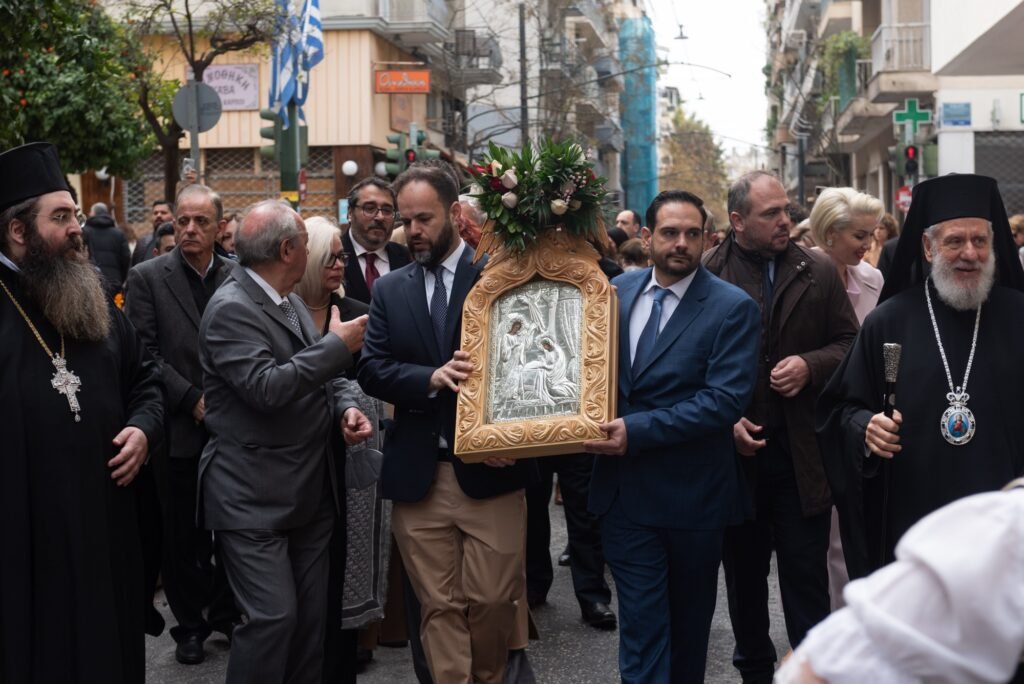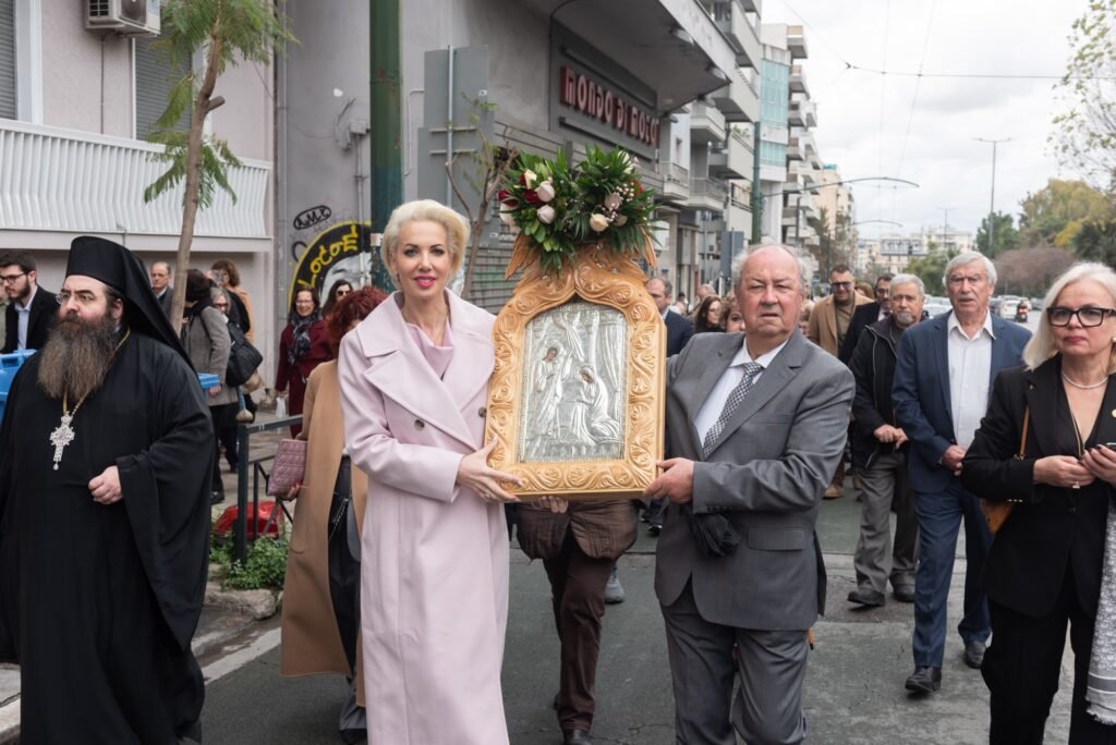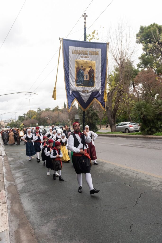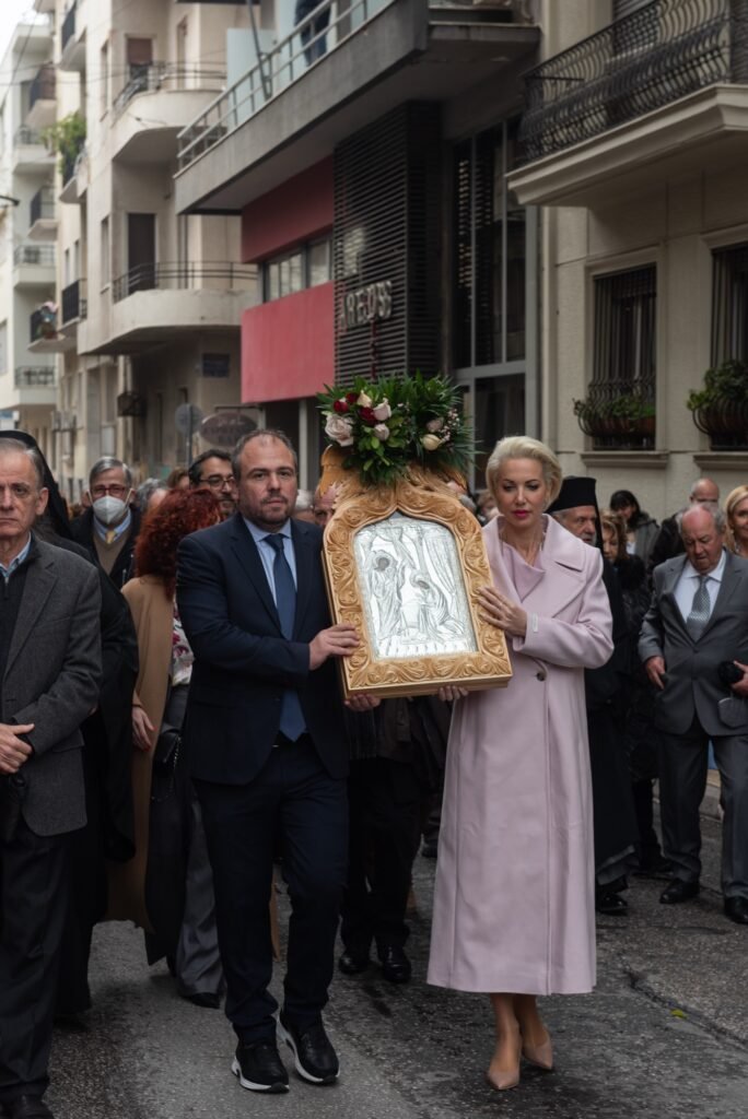 Ακολούθως, με τη συνοδεία της Φιλαρμονικής του Λιμενικού Σώματος και του Χορευτικού Τμήματος του Συλλόγου Μαρλά – Μαμάδουμε παραδοσιακές φορεσιές, έγινε η μεταφορά της Εικόνας,  μέσω της Λ. Αλεξάνδρας, στο κτήριο της Αδελφότητας. Ο Πρόεδρος του ΔΣ κ. Εμμανουήλ Σκαρής καλωσόρισε τους παρευρισκόμενους και αναφέρθηκε συνοπτικά στη σημασία της εορτής.