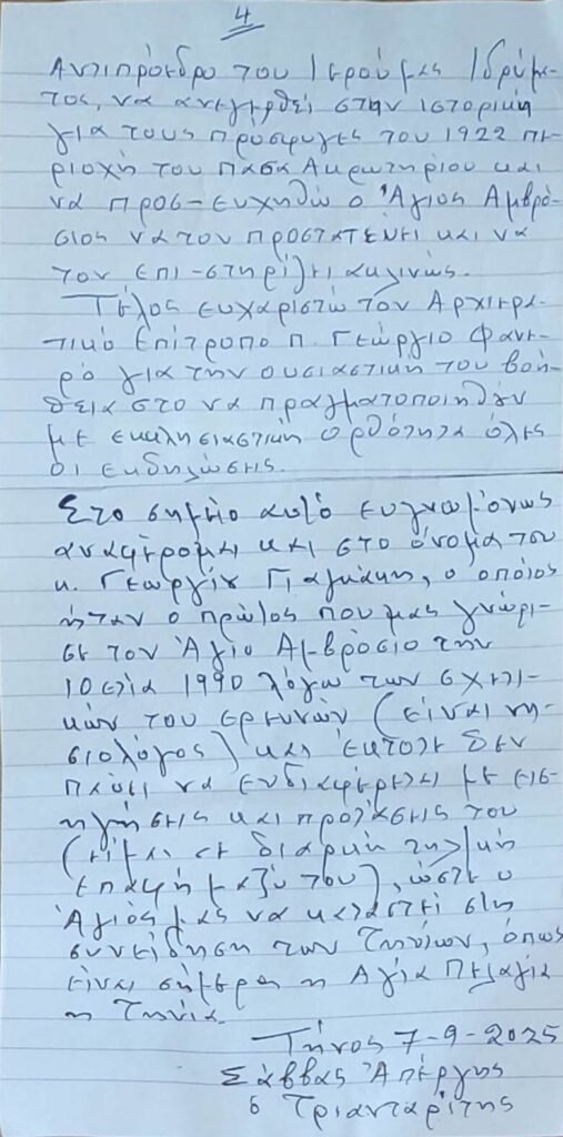 Μήνυμα ευγνωμοσύνης του Σάββα Απέργη, Τριανταρίτη και πρώην Δημάρχου Τήνου, με αφορμή τις τιμητικές εκδηλώσεις που έλαβαν χώρα στο Τριαντάρο για τη μνήμη του Αγίου Ενδόξου Ιερομάρτυρος Αμβροσίου, Μητροπολίτου Μοσχονησίων, ο οποίος κατάγεται από το χωριό.