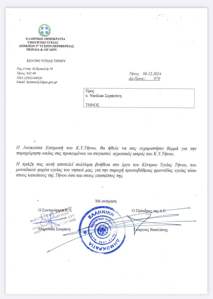 Ευχαριστήριο του Κέντρου Υγείας Τήνου για την παραχώρηση κατοικίας σε Αγροτικό Ιατρό