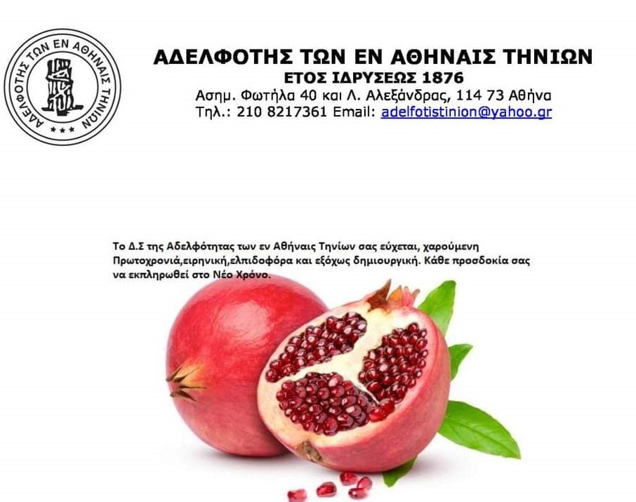 Το Δ.Σ της Αδελφότητας των εν Αθήναις Τηνίων σας εύχεται, χαρούμενη Πρωτοχρονιά, ειρηνική, ελπιδοφόρα και εξόχως δημιουργική. Κάθε προσδοκία σας να εκπληρωθεί στο Νέο Χρόνο.