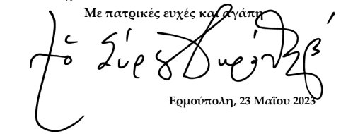 Ολόψυχα και πατρικά σου εύχομαι «ΚΑΛΗ ΕΠΙΤΥΧΙΑ» και σε διαβεβαιώνω θα βρίσκομαι πάντοτε δίπλα σου, συμπαραστάτης και βοηθός σου στις δυσκολίες