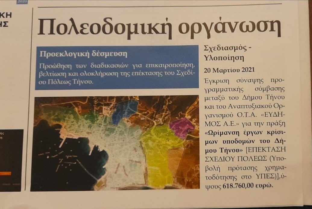 Τα επικοινωνιακά τεχνάσματα που χρησιμοποιεί ο δήμαρχος Τήνου λίγο πριν τις εκλογές δεν θα πρέπει να παραπλανούν τους συνδημότες μας. Για την αντικειμενική και ορθή ενημέρωσή τους,  οφείλουμε να απαντήσουμε στα όσα υπεστήριξε περί επέκτασης σχεδίου πόλης με σαφήνεια, δίνοντας την πραγματική διάσταση του θέματος. Ο κ. Δήμαρχος λίγο – πολύ μας είπε ότι εγκρίθηκε η επέκταση του σχεδίου πόλεως από το Ελεγκτικό συνέδριο!
