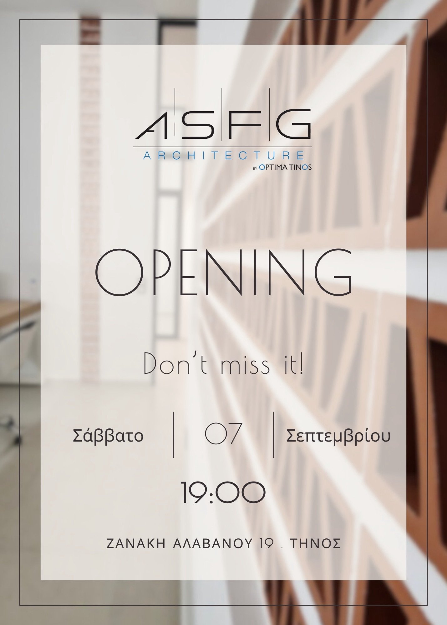 Η εκδήλωση των εγκαινίων θα πραγματοποιηθεί το Σάββατο, 7 Σεπτεμβρίου, στις 19:00, στην οδό Ζανάκη Αλαβάνου 19. Οι προσκεκλημένοι θα έχουν την ευκαιρία να γνωρίσουν από κοντά τις νέες εγκαταστάσεις του γραφείου και να ανακαλύψουν τη φιλοσοφία και το όραμα πίσω από τη ASFG Architecture.