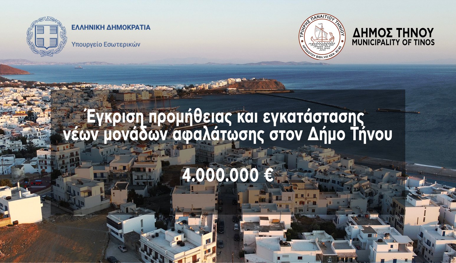 Μετά από συντονισμένες κινήσεις και αλλεπάλληλες συναντήσεις του Δημάρχου Τήνου Παναγιώτη Κροντηρά με την πολιτική ηγεσία του Υπουργείου Εσωτερικών, και τον αρμόδιο Αναπληρωτή Υπουργό Θεόδωρο Λιβάνιο πετύχαμε σήμερα μια πολύ σημαντική διεκδίκηση. Ο Δήμος Τήνου βρίσκεται στην ευχάριστη θέση να ανακοινώσει την έγκριση χρηματοδότησης από το Υπουργείο Εσωτερικών με το ποσο των 4εκ. ευρώ για την δημιουργία εργοστασίου αφαλάτωσης στο νησί!