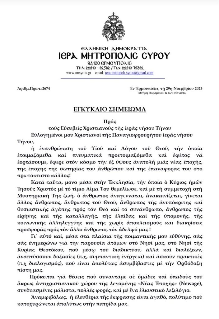 Εγκύκλιο σημείωμα Σεβασμιώτατου Σύρου – Τήνου κ. Δωρόθεου περι νεάς εποχής