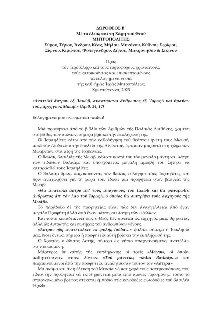 Εγκύκλιος Χριστουγέννων Μητροπολίτου Σύρου-Τήνου κ. Δωροθέου Β’ 2023