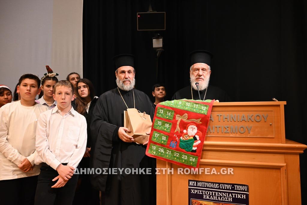 Τα παιδιά παρουσίασαν ποιήματα, χριστουγεννιάτικα τραγούδια και θεατρικά δρώμενα, ενθουσιάζοντας και εντυπωσιάζοντας τους ακροατές για την ευπρεπή, πολιτισμένη και ευγενική εμφάνισή τους, ενώ ομίλησαν καταλλήλως ο Πανοσιολ. Αρχιμ. π. Δοσίθεος και ο Αρχιερατικός Επίτροπος Τήνου της Ιεράς νήσου Τήνου.