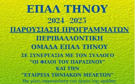 Το ΕΠΑΛ Τήνου έχει την τιμή να σας προσκαλέσει στην παρουσίαση των προγραμμάτων που εκπονήθηκαν στο σχολείο μας τη φετινή χρονιά: