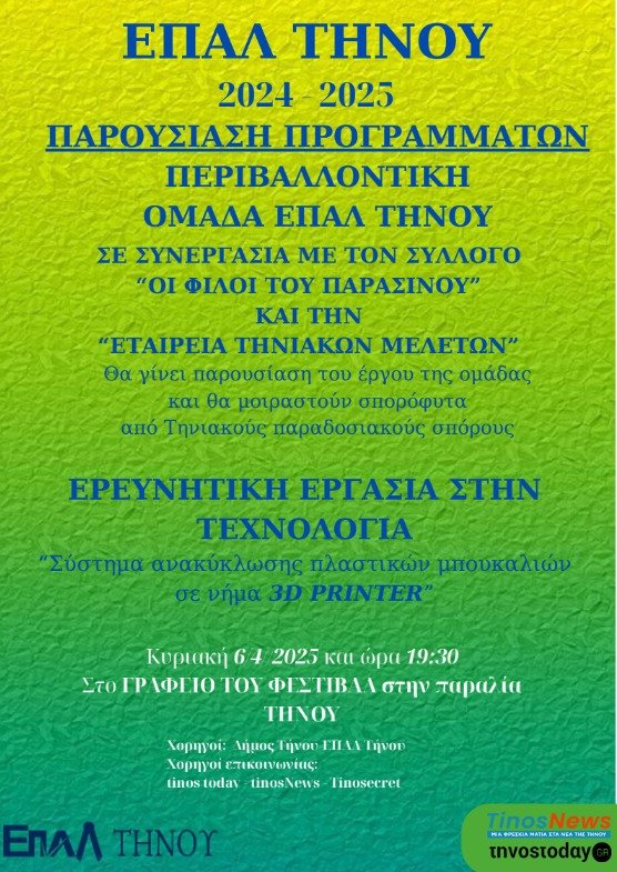 Ι. Η Περιβαλλοντική Ομάδα σε συνεργασία με τον σύλλογο “Οι Φίλοι του Πράσινου” και την “Εταιρεία Τηνιακών Μελετών” θα παρουσιάσει τις δράσεις της στα πλαίσια του προγράμματος Περιβαλλοντικής Εκπαίδευσης με τίτλο :«Διάσωση και διάδοση Παραδοσιακών σπόρων και ποικιλιών – Ξερολιθιά και παραδοσιακές καλλιέργειες» και θα μοιραστούν δωρεάν σποριόφυτα από Τηνιακούς παραδοσιακούς σπόρους