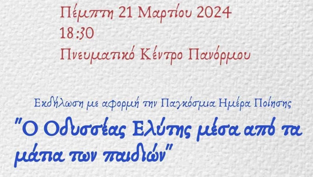 Η εκδήλωση θα πραγματοποιηθεί την Πέμπτη 21 Μαρτίου 2024 στις 18:30 στο Πνευματικό Κέντρο Πανόρμου.