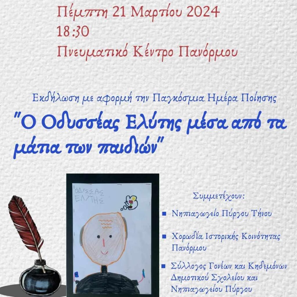 Το Νηπιαγωγείο Πύργου Τήνου σε συνεργασία με τη Χορωδία Ιστορικής Κοινότητας Πανόρμου και το Σύλλογο Γονέων και Κηδεμόνων Δημοτικού Σχολείου και Νηπιαγωγείου Πύργου Τήνου θα παρουσιάσουν μια εκδήλωση αφιερωμένη στη μελοποιημένη ποίηση με αφορμή την Παγκόσμια Ημέρα Ποίησης.