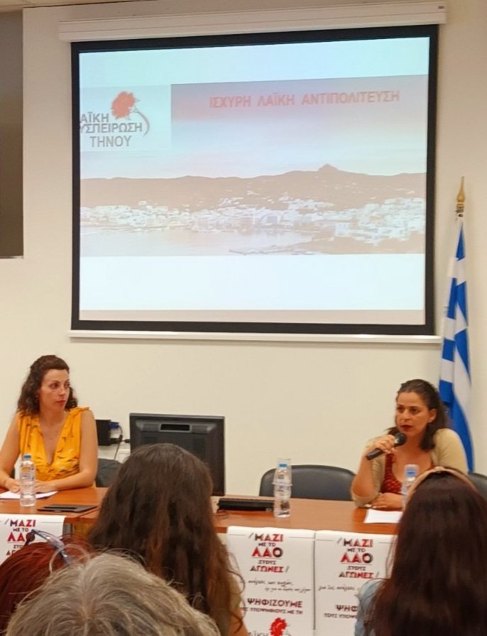 Σε κλίμα ενθουσιασμού παρουσιάστηκαν την Τετάρτη 13 Σεπτεμβρίου 2023 στην αίθουσα του Επιμελητηρίου Τήνου, οι υποψήφιοι με το ψηφοδέλτιο της «Λαϊκής Συσπείρωσης Τήνου» στο δήμο Τήνου, καθώς και οι υποψήφιοι Περιφερειακοί Σύμβουλοι της «Λαϊκής Συσπείρωσης Νοτίου Αιγαίου» για την Περιφερειακή Ενότητα Τήνου. Συγκινητική ήταν και η μεγάλη ανταπόκριση των παρευρισκομένων στο κάλεσμα για συλλογή ειδών πρώτης βοήθειας για τους πλημμυροπαθείς της Θεσσαλίας και του Βόλου.