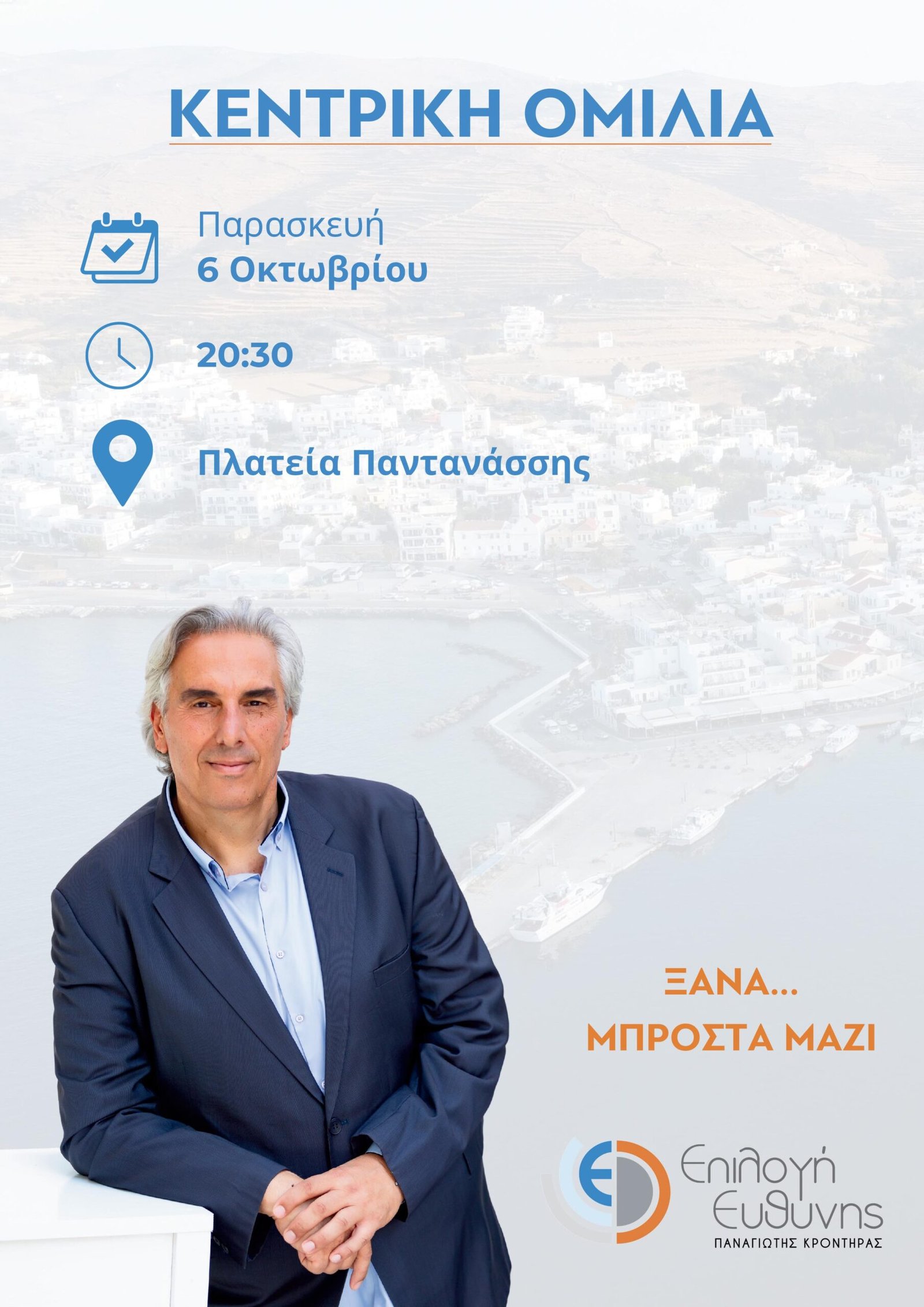 Στις 8:30 μ.μ την Παρασκευή 6 Οκτωβρίου ο επικεφαλής του συνδυασμού «Επιλογή Ευθύνης » θα πραγματοποιήσει την κεντρική ομιλία του, κλείνοντας την αυλαία της προεκλογικής του εκστρατείας.
