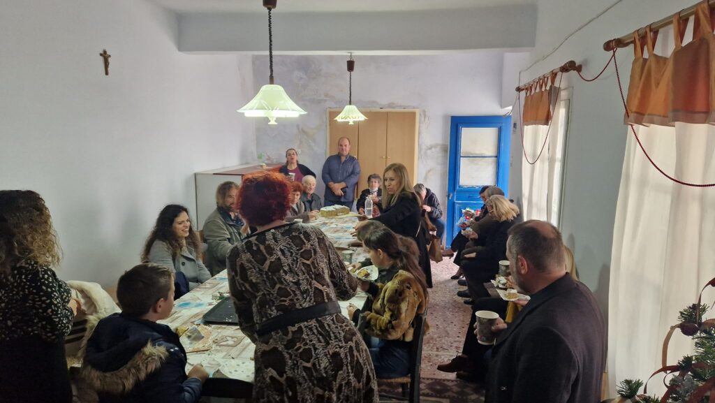 Παρών στην κοπή της πίτας ήταν ο εφημέριος π. Φραγκισκος Βιδάλης, οπου εδωσε τις ευχές του στο χωριό. Μέλη από τη νέα Δημοτική Αρχή και χωριανοί.