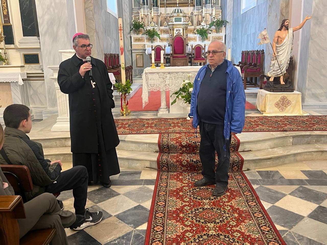Αρχικό σταθμό της επίσκεψης αποτέλεσε η παρουσία στον Ιερό Καθεδρικό Ναό της Παναγίας του Ροδαρίου, όπου οι μαθητές ενημερώθηκαν από τον Σεβασμιώτατο Αρχιεπίσκοπο Νάξου–Τήνου Ιωσήφ Πρίντεζης για την ιστορική πορεία και τη σύγχρονη πραγματικότητα της Καθολικής κοινότητας στο νησί. Μέσα από την παρουσίασή του αναδείχθηκε με σαφήνεια το πρότυπο ειρηνικής συνύπαρξης Ορθοδόξων και Καθολικών στην Τήνο, καθώς και το βαθύ κλίμα αλληλοσεβασμού που χαρακτηρίζει την τοπική κοινωνία.