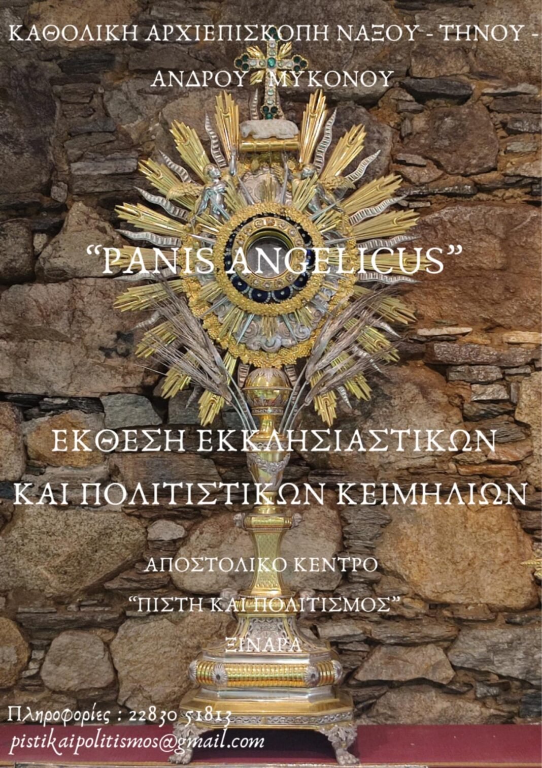 Η Καθολική Αρχιεπισκοπή Νάξου-Τήνου σάς προσκαλεί στη Έκθεση Εκκλησιαστικών και Πολιτιστικών Κειμηλίων “Panis Angelicus” που βρίσκεται στην Ξινάρα της Τήνου κατά την Αγία και Μεγάλη Εβδομάδα και την Διακαινήσιμο Εβδομάδα.