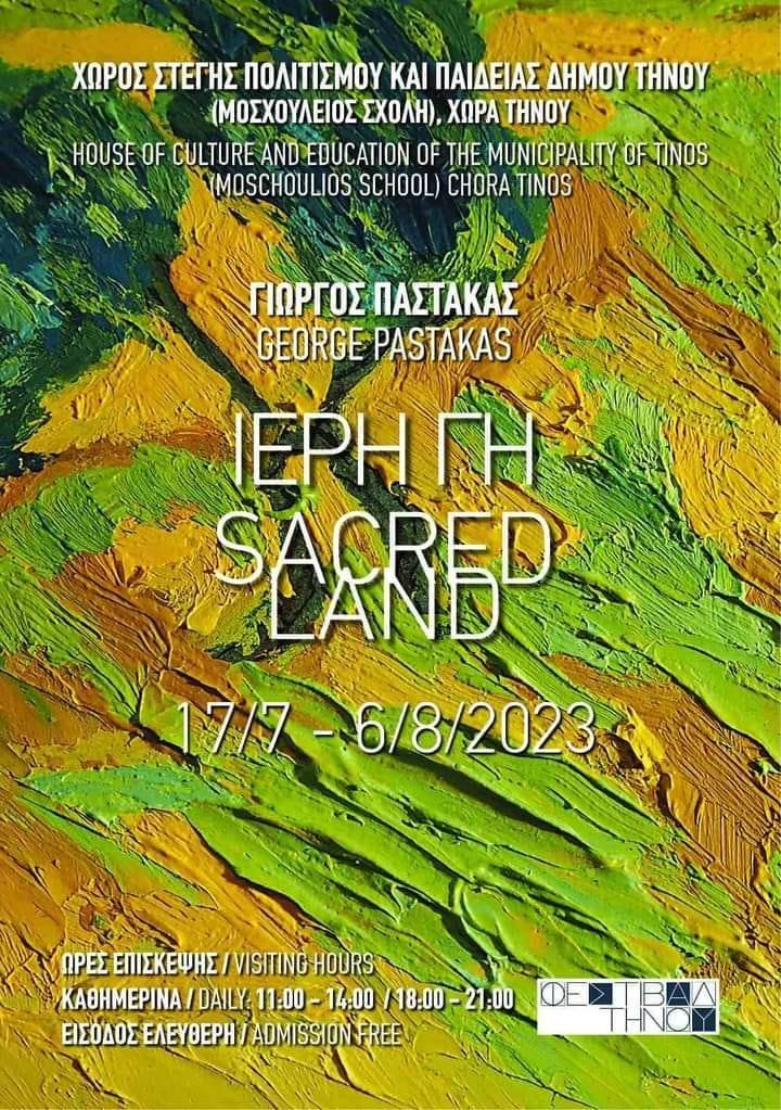 «Ιερή Γη» τιτλοφορείται η τελευταία έκθεση του Γιώργου Παστάκα που πραγματεύεται τοπία της Τήνου και εγκαινιάζεται στις 17 Ιουλίου και ώρα 19:00 το απόγευμα στον Χώρο Στέγης Πολιτισμού και Παιδείας του Δήμου Τήνου (Μοσχούλειος Σχολή) στην Χώρα του νησιού. Με αφορμή το εορταστικό έτος για τα 200 χρόνια από την Εύρεση της εικόνας του Ευαγγελισμού, δημιουργήθηκε μια ζωγραφική σειρά που υμνεί το Τηνιακό τοπίο. Όπως αναφέρεται στο κείμενο της έκθεσης, «πραγματεύεται όλα αυτά τα στοιχεία που οδήγησαν το νησί να εκπέμπει μια ακαταμάχητη γοητεία στους ανθρώπους των τεχνών.