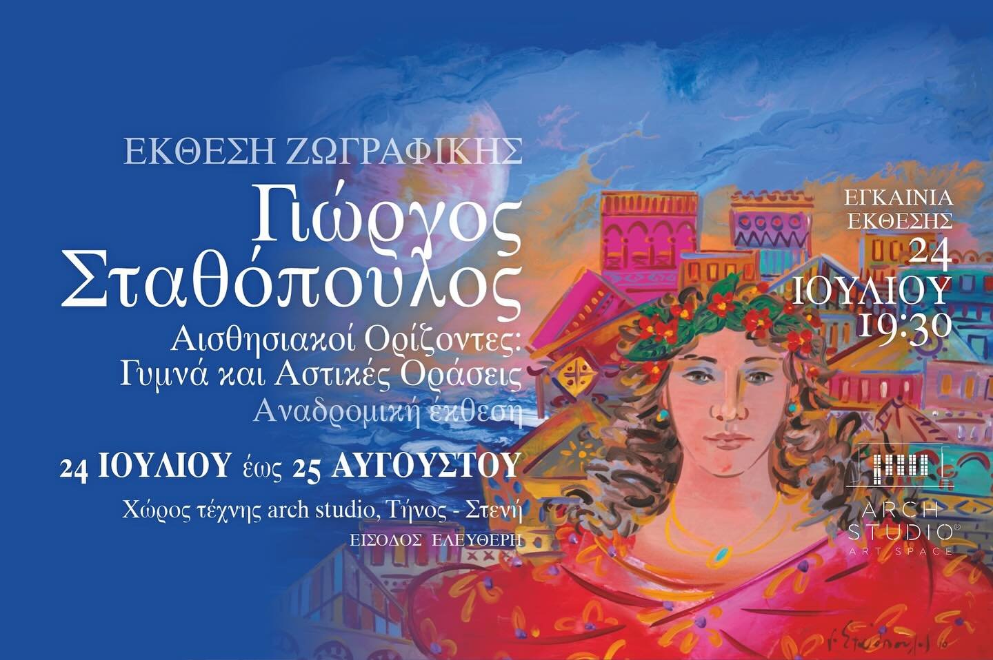Ο χώρος τέχνης Arch Studio στην Τήνο φιλοξενεί την έκθεση ζωγραφικής του διακεκριμένου Έλληνα ζωγράφου Γιώργου Σταθόπουλου, Αισθησιακοί Ορίζοντες: Γυμνά και Αστικές Οράσεις, από τις 24 Ιουλίου έως τις 25 Αυγούστου 2024.