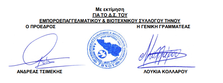 Τηνίων» του Εμποροεπαγγελματικού & Βιοτεχνικού Συλλόγου Τήνου.
