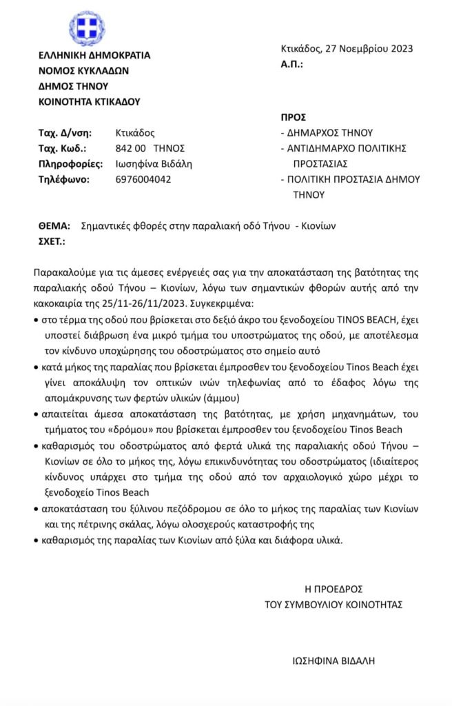 Έγγραφο της Κοινότητας Κτικάδου για τις φθορές στην παραλιακή οδό Τήνου – Κιονίων προς την Πολιτική Προστασία του Δήμου Τήνου