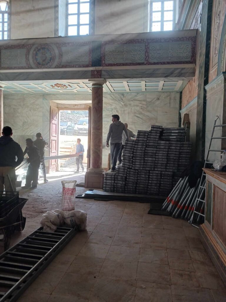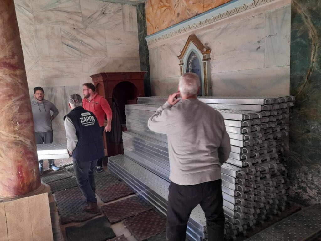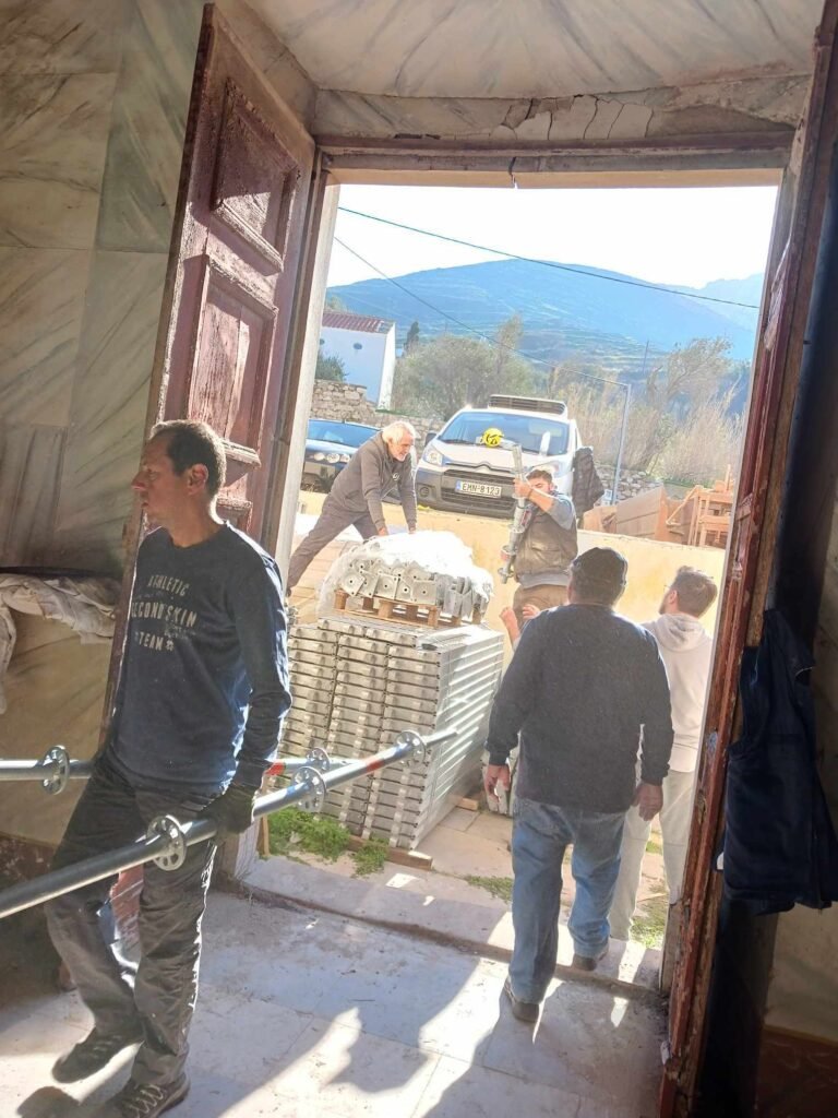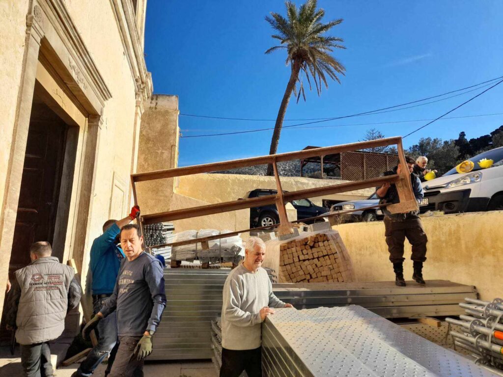 Η Κυριακή 4 Φεβρουαρίου ήταν μια σημαντική και συγκινητική μέρα καθώς 25 εθελοντές συμμετείχαν στον εσωτερικό καθαρισμό του Ναού και τη μεταφορά των ικριωμάτων (σκαλωσιές) που από μερικές μέρες είχαν φθάσει στη Τήνο, προκειμένου να προχωρήσουν το συντομότερο οι εργασίες τοποθέτησής τους. Να αναφερθεί ότι όλα τα υλικά διατέθηκαν από το Υπουργείο Πολιτισμού και πως οι εργασίες στο σύνολό τους διεξάγονται από την Εφορία Αρχαιοτήτων Κυκλάδων.