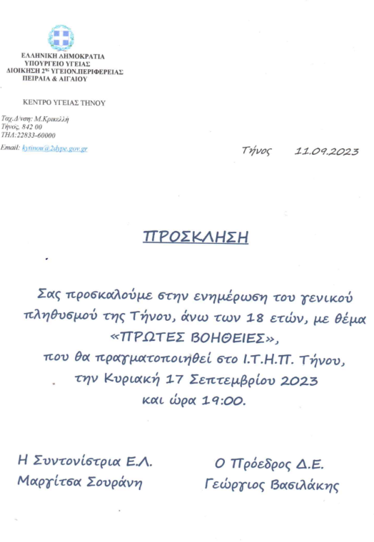 Σας προσκαλούμε στην ενημέρωση του γενικού πληθυσμού της Τήνου, άνω των 18 ετών, με θέμα “Πρώτες Βοήθειες” που θα πραγματοποιηθεί στο Ι.Τ.Η.Π. την Κυριακή, 17 Σεπτεμβρίου 2023 στις 19:00.