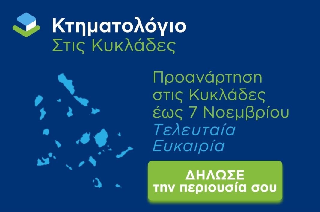 Ξεκίνησε η διαδικασία Προανάρτησης κτηματολογικών στοιχείων για όσους δήλωσαν την ακίνητη περιουσία τους σε περιοχές των Καλλικρατικών Δήμων Άνδρου, Ανάφης, Θήρας, Ίου, Σικίνου, Φολεγάνδρου, Κέας, Κύθνου, Μήλου, Σερίφου, Μυκόνου, Αμοργού, Νάξου & Μικρών Κυκλάδων, Αντιπάρου, Πάρου και Τήνου, της Περιφέρειας Νοτίου Αιγαίου.