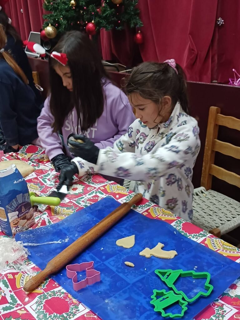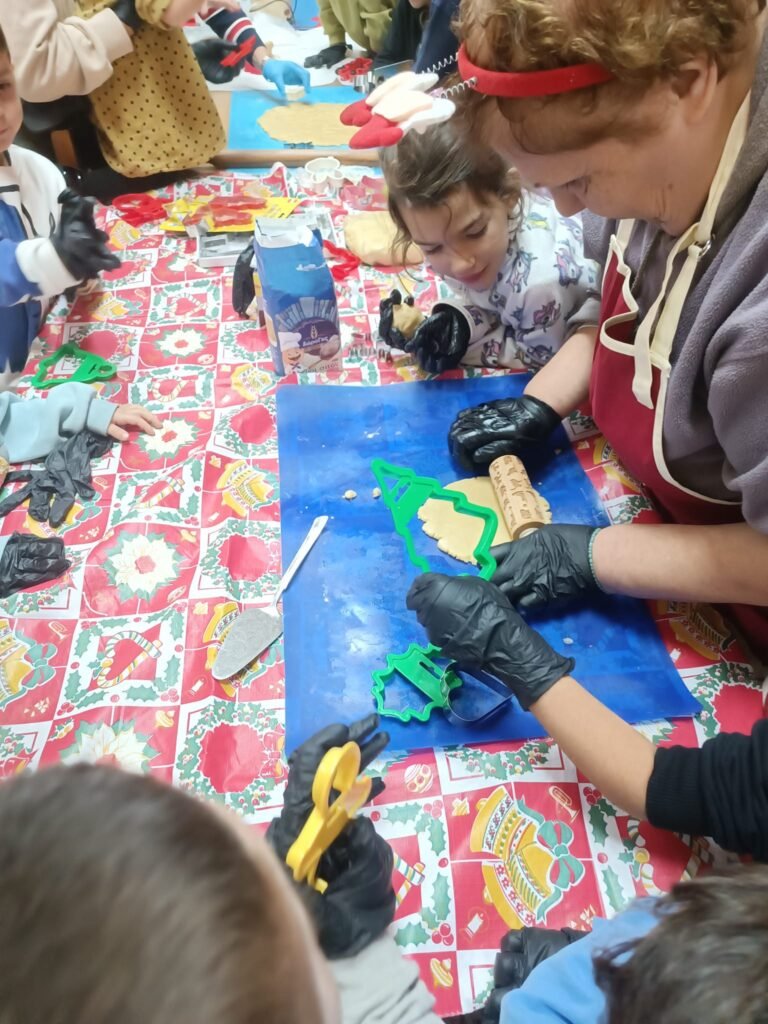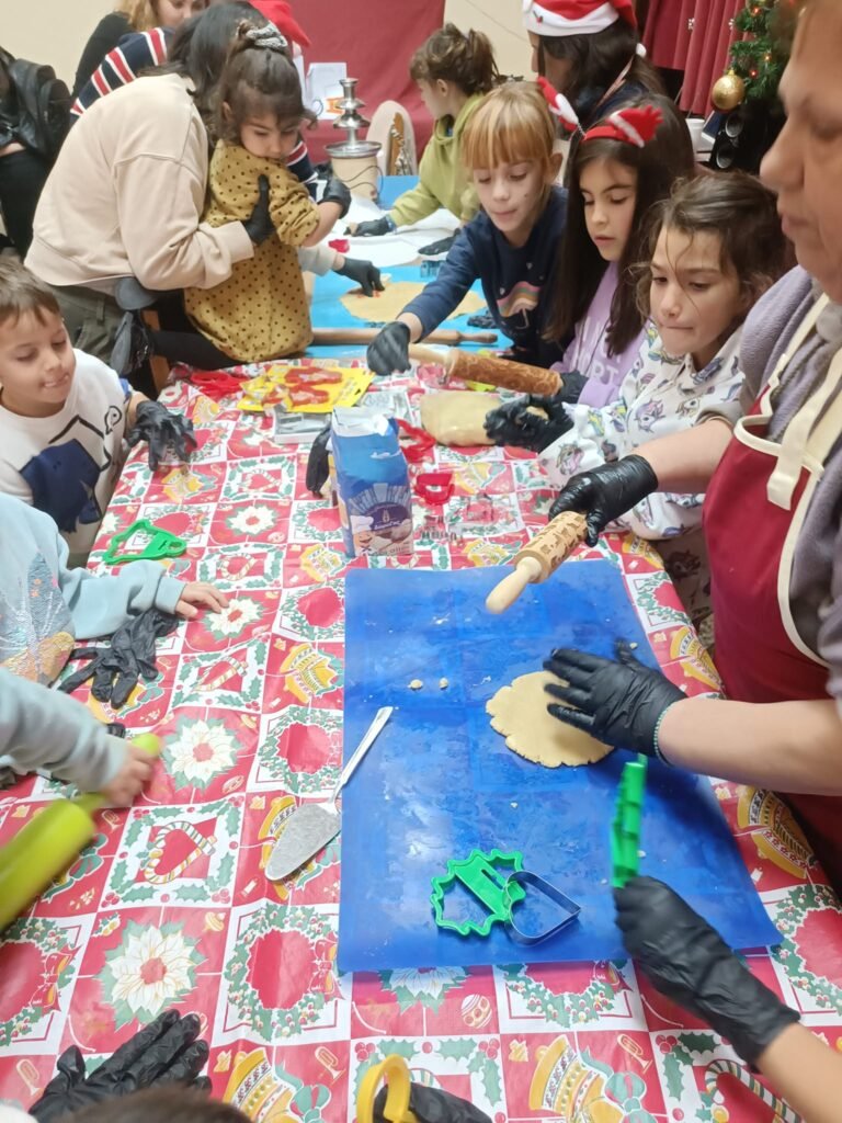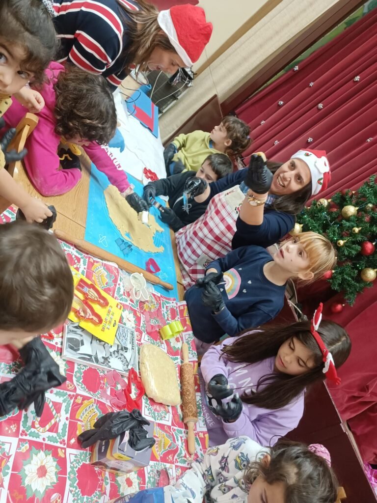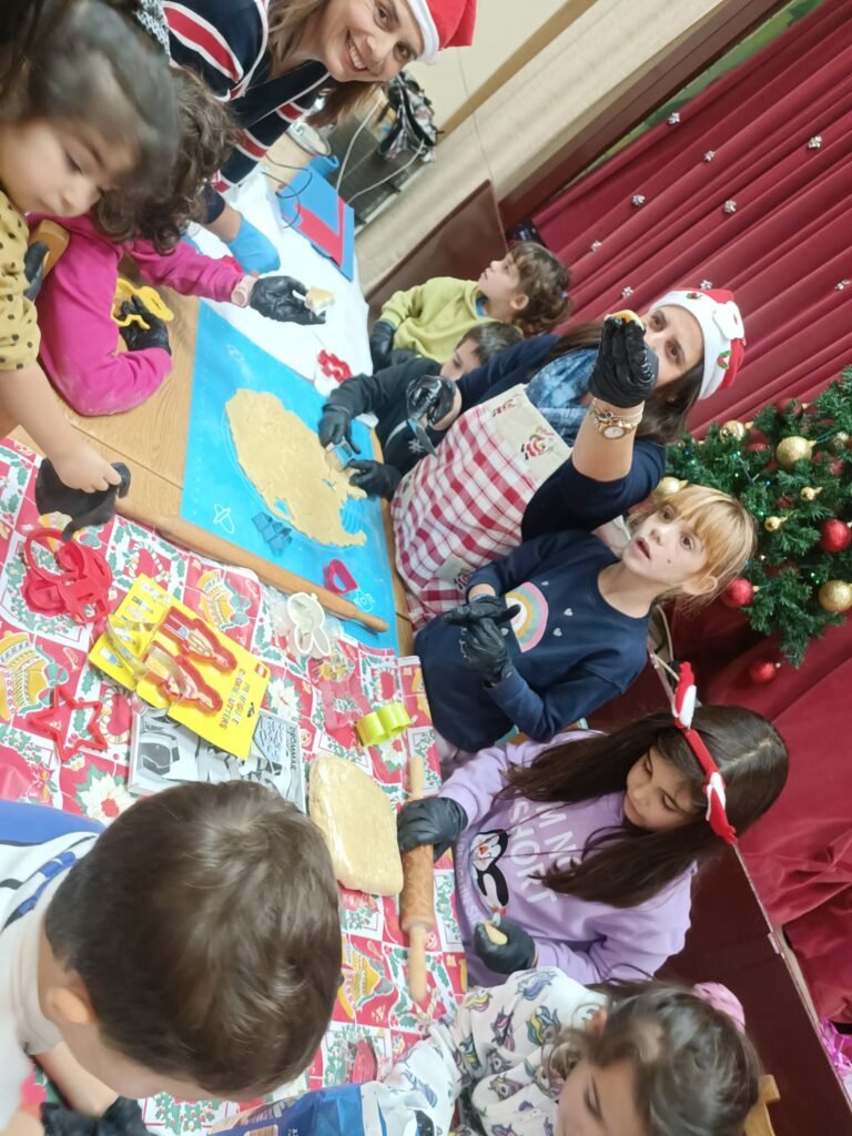 Μαζί με τα παιδιά ζωγραφίσαμε, παίξαμε και φτιάξαμε χριστουγεννιάτικα στολίδια απο χαρτόνι και γύψο.. τα παιδιά έφτιαξαν τα δικά τους μπισκότα τα οποία ψήσαμε και γέμισε η αίθουσα με ευχάριστες μυρωδιές και αρώματα.. Στη συνέχεια απόλαυσαν τις δημιουργίες τους, αφού πρώτα τις βούτηξαν στο λαχταριστό συντριβάνι σοκολάτας!