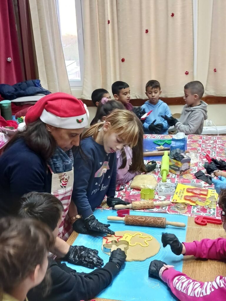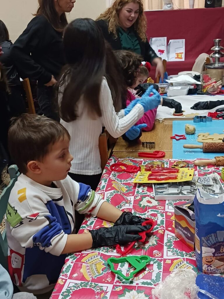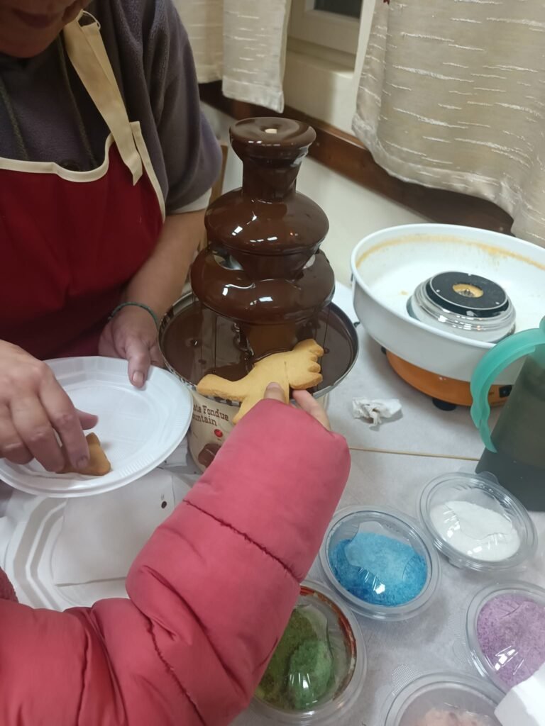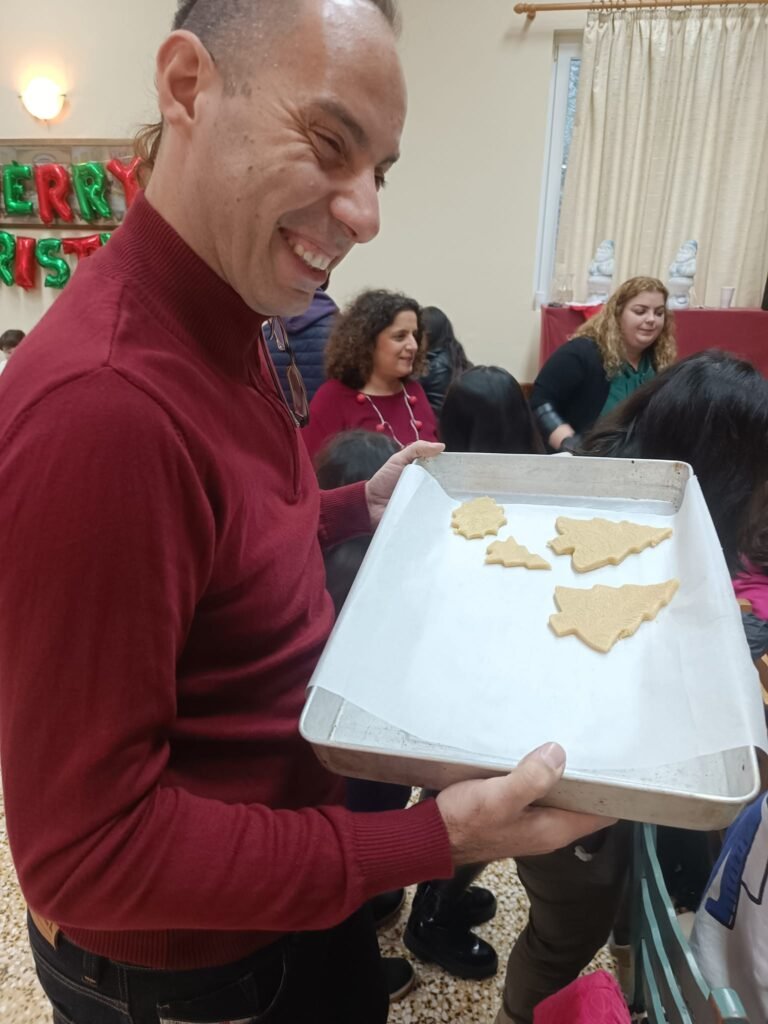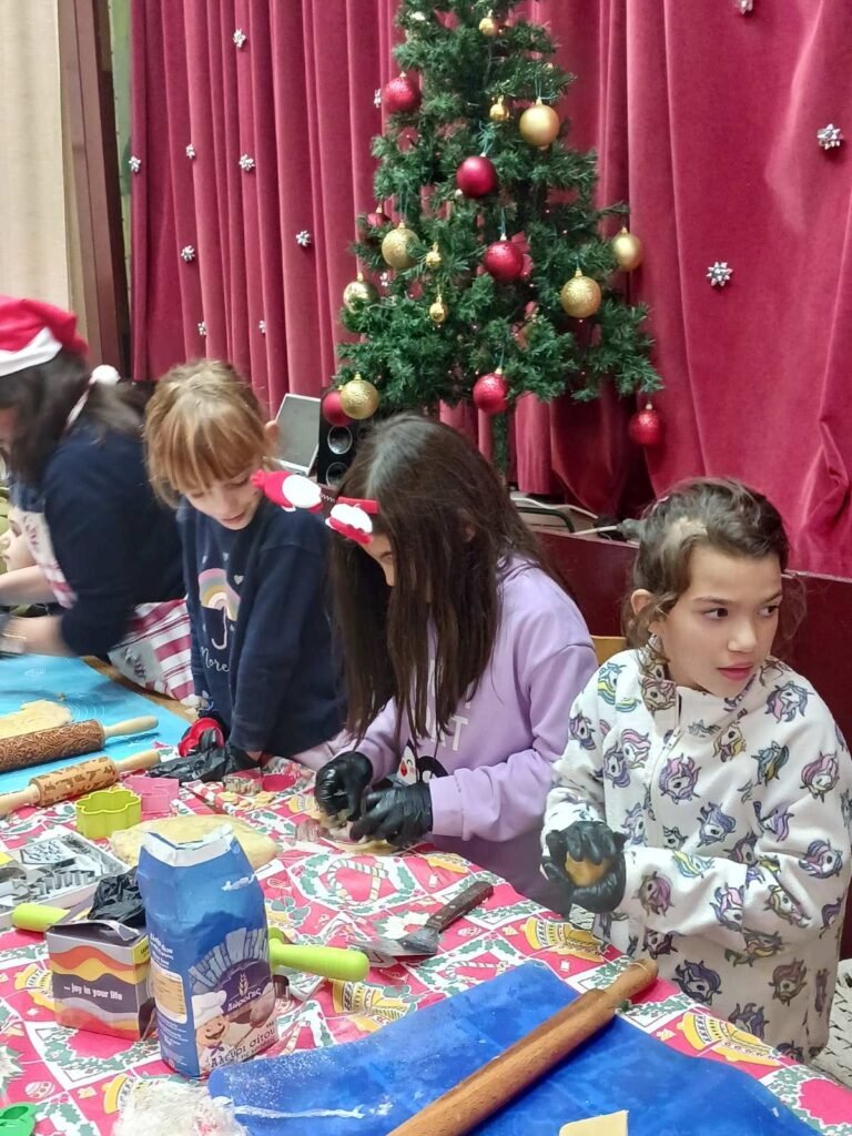 Μαζί με τα παιδιά ζωγραφίσαμε, παίξαμε και φτιάξαμε χριστουγεννιάτικα στολίδια απο χαρτόνι και γύψο.. τα παιδιά έφτιαξαν τα δικά τους μπισκότα τα οποία ψήσαμε και γέμισε η αίθουσα με ευχάριστες μυρωδιές και αρώματα.. Στη συνέχεια απόλαυσαν τις δημιουργίες τους, αφού πρώτα τις βούτηξαν στο λαχταριστό συντριβάνι σοκολάτας!