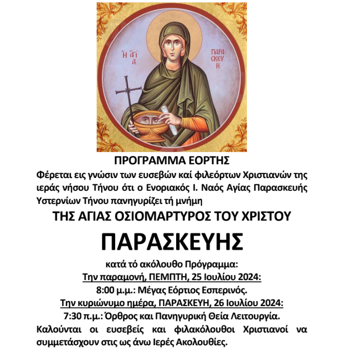 Φέρεται εις γνώσιν των ευσεβών καί φιλεόρτων Χριστιανών της ιεράς νήσου Τήνου ότι ο Ενοριακός Ι. Ναός Αγίας Παρασκευής Υστερνίων Τήνου πανηγυρίζει τή μνήμη ΤΗΣ ΑΓΙΑΣ ΟΣΙΟΜΑΡΤΥΡΟΣ ΤΟΥ ΧΡΙΣΤΟΥ ΠΑΡΑΣΚΕΥΗΣ κατά τό ακόλουθο Πρόγραμμα: