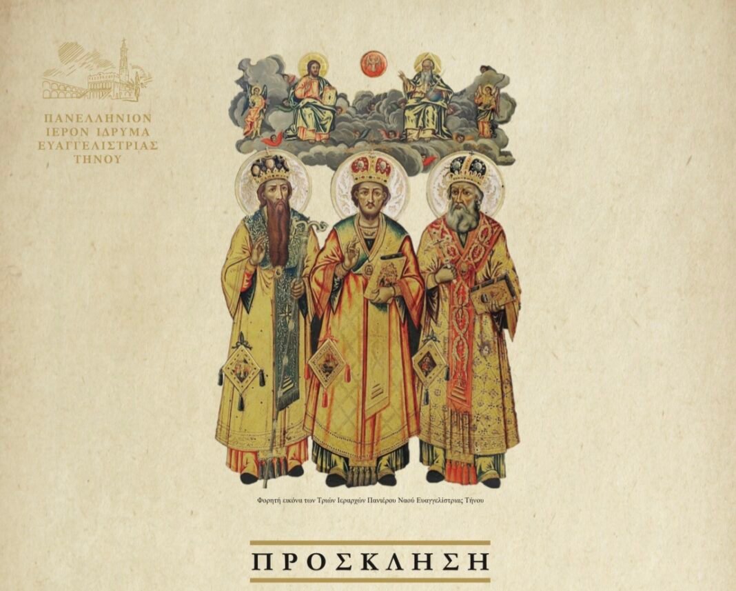 Αγαπητοί/ες μαθητές/τριες, εκπαιδευτικοί και γονείς, σας προσκαλούμε το Σάββατο 31 ανουαρίου 2026 και ώρα 11:30 π.μ. στον Πανίερο Ναό της Μεγαλόχαρης Τήνου για να τιμήσουμε τους Τρεις Iεράρχες, προστάτες της παιδείας.