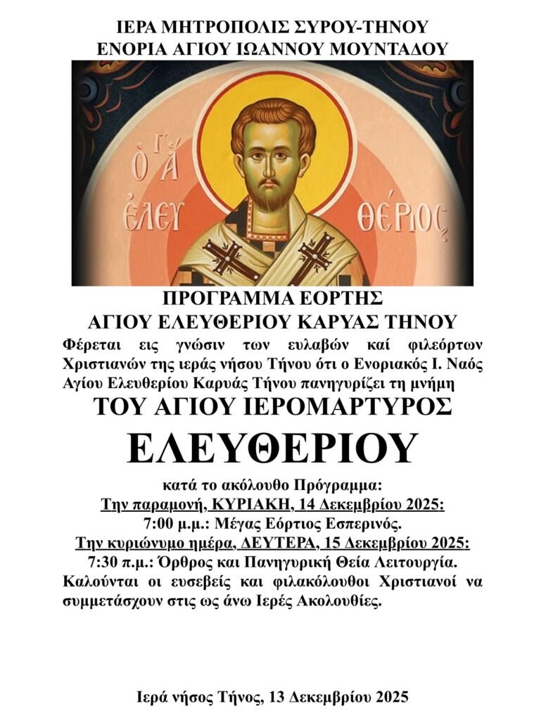 Η Ιερά Μητρόπολη Σύρου – Τήνου και οι Ενοριακοί Ιεροί Ναοί του Αγίου Ελευθερίου Καρύας και του Αγίου Νικολάου – Αγίου Ελευθερίου πόλεως Τήνου ανακοινώνουν τον εορτασμό της μνήμης του Αγίου Ιερομάρτυρος Ελευθερίου.
