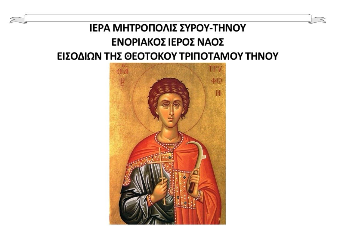 Ο Ιερός Ναός Εισοδίων της Θεοτόκου Τριποτάμου Τήνου πανηγυρίζει τη μνήμη του Αγίου Μάρτυρος Τρύφωνος.