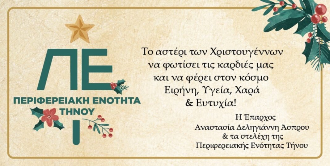 Η Έπαρχος Αναστασία Δεληγιάννη Άσπρου και τα στελέχη της Περιφερειακής Ενότητας Τήνου εύχονται το αστέρι των Χριστουγέννων να φωτίσει τις καρδιές όλων, φέρνοντας Ειρήνη, Υγεία, Χαρά και Ευτυχία.