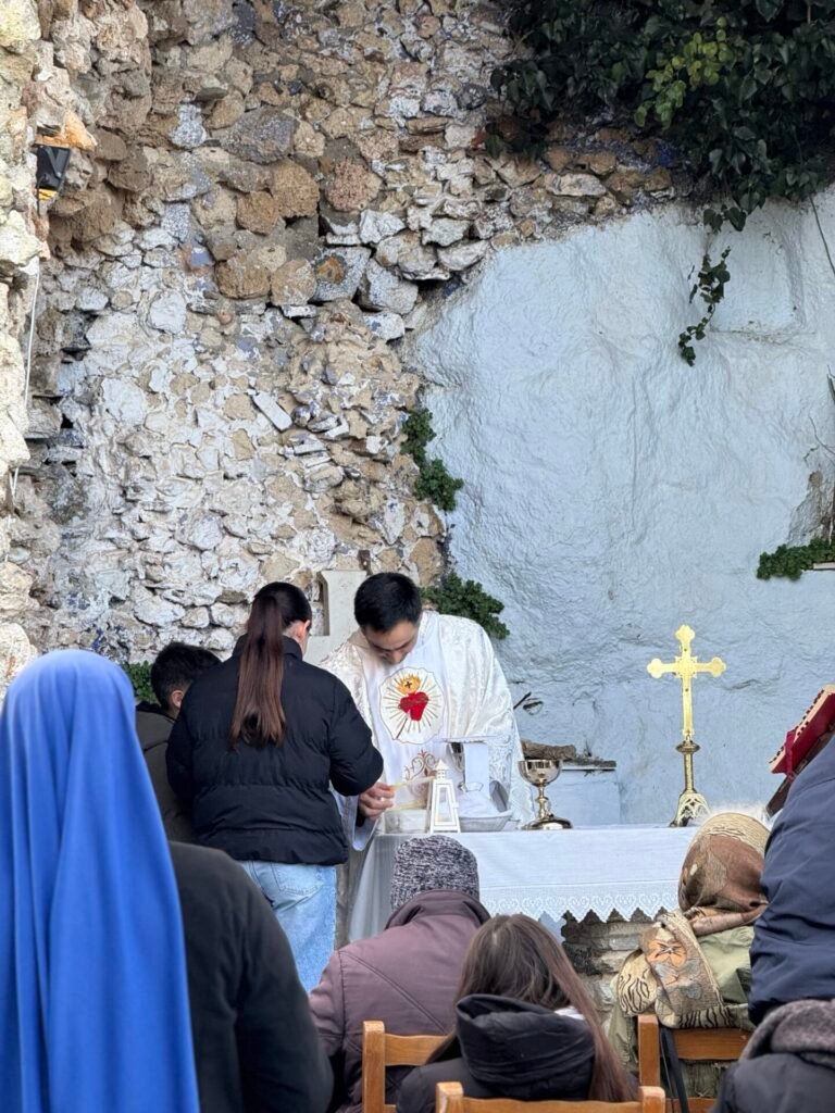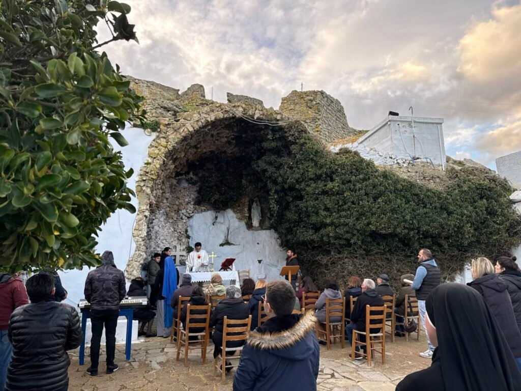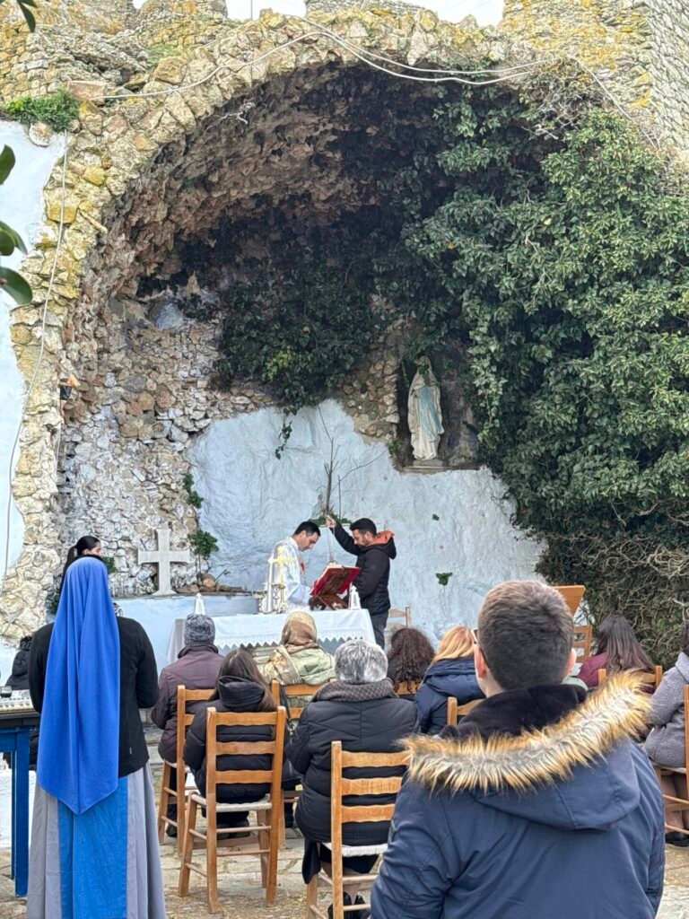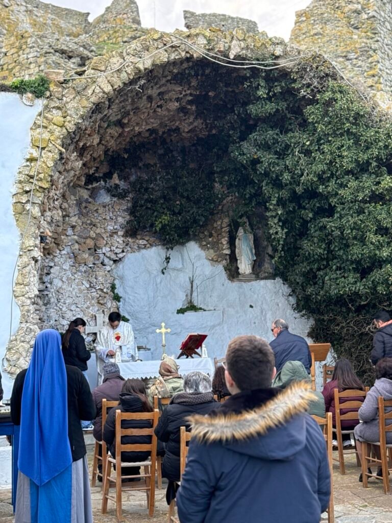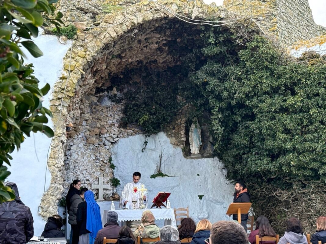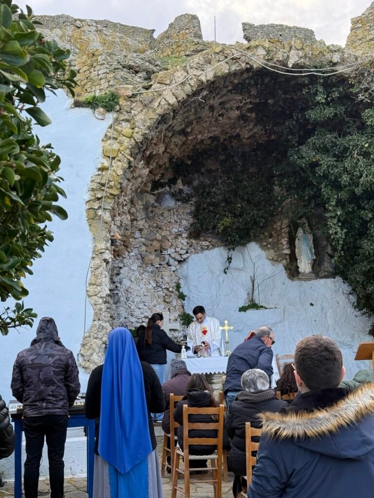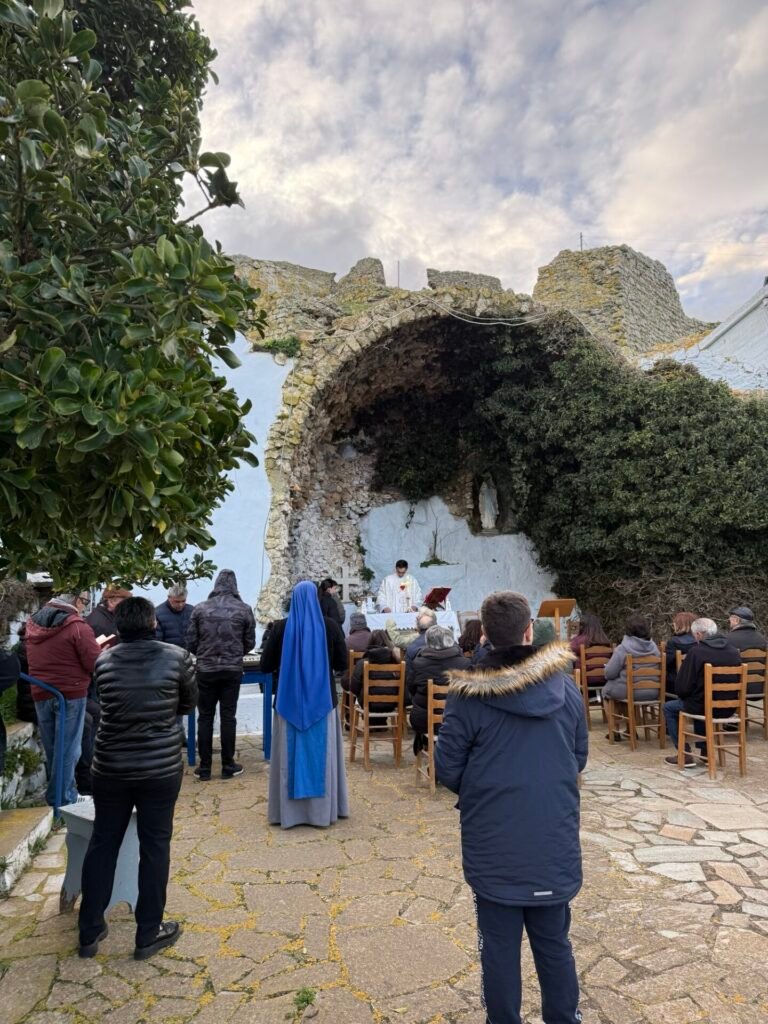 Στην κατανυκτική ατμόσφαιρα της «Σπηλιάς της Λούρδης», στο Προσκύνημα της Ιεράς Καρδίας του Ιησού στο Εξώμβουργο, τελέστηκε η Θεία Λειτουργία για την επέτειο της εμφάνισης της Αμώμου Συλλήψεως της Παναγίας στην Αγία Βερναρδέτη (Λούρδη, 1858).