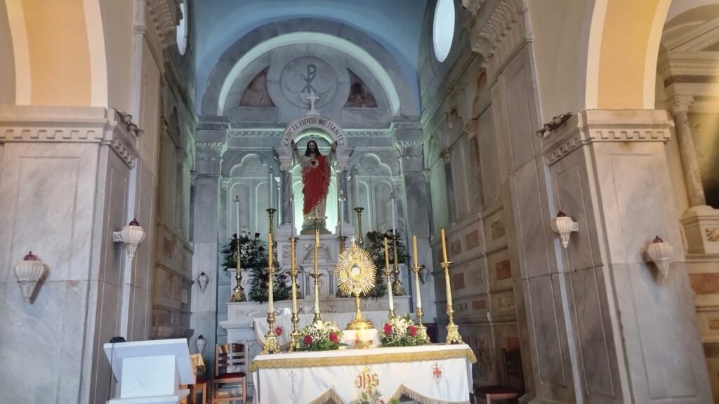 Ανήμερα της εορτής, την Παρασκευή 12 Ιουλίου, ο αρχιεπίσκοπος μας σεβ/τος π. Ιωσήφ, πλαισιωμένος από πλειάδα ιερέων τέλεσε την θεία Λειτουργία νωρίς το βράδυ και ακολούθησε η έκθεση και προσκύνηση του Αγιοτάτου Μυστηρίου του Σώματος του Κυρίου για 40 ώρες, μέχρι την Κυριακή νωρίς το πρωί. Έτσι δόθηκε η ευκαιρία σε όσους ευλαβείς επιθυμούσαν, να μεταβούν στον ναό της Ιεράς Καρδίας την ώρα που διευκολύνονταν και να προσκυνήσουν το Αγιότατο Μυστήριο κατά μόνας. Αξίζει να σημειωθεί ότι σ’ αυτή την Θεία Λειτουργία συλλειτούργησε και ο ηγούμενος των πατέρων Ιησουιτών στην Ελλάδα π. Πιερ Σελαμπιέ, στο πρόσωπο του οποίου ο σεβ/τος αρχιεπίσκοπος θέλησε να ευχαριστήσει όλο το τάγμα των Ιησουιτών πατέρων, που ουσιαστικά δημιούργησαν και διακόνησαν αυτό το προσκύνημα επί αιώνες.