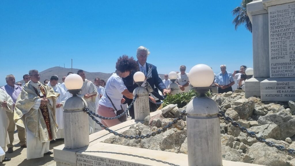 Πριν την λήξη της Λειτουργίας, σχηματίστηκε λιτανευτική πομπή μέχρι το μνημείο των Ηρώων Πεσόντων στους πολέμους της πατρίδος μας, που υψώνεται εντός της αυλής του Προσκυνήματος, όπου σύμφωνα με το έθιμο, τελέστηκε από τον σεβ/το π. Ιωσήφ επιμνημόσυνη δέηση, κατάθεση στεφάνου εκ μέρους του δήμου Τήνου από τον κ. Δήμαρχο, με την παρουσία της κ. Επάρχου και απαγγέλθηκε ο Εθνικός μας Ύμνος.