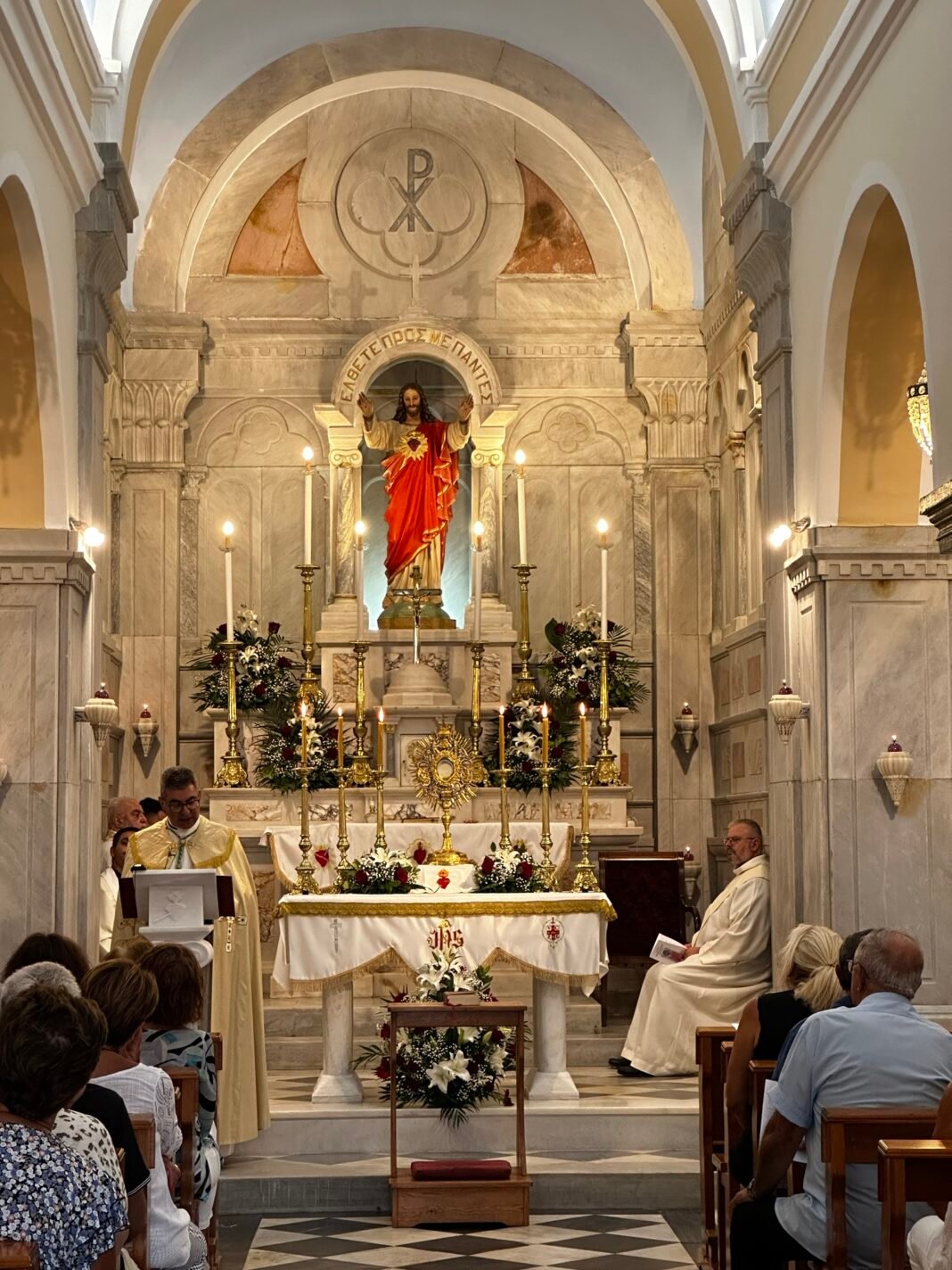 Ανήμερα της εορτής, την Παρασκευή 12 Ιουλίου, ο αρχιεπίσκοπος μας σεβ/τος π. Ιωσήφ, πλαισιωμένος από πλειάδα ιερέων τέλεσε την θεία Λειτουργία νωρίς το βράδυ και ακολούθησε η έκθεση και προσκύνηση του Αγιοτάτου Μυστηρίου του Σώματος του Κυρίου για 40 ώρες, μέχρι την Κυριακή νωρίς το πρωί. Έτσι δόθηκε η ευκαιρία σε όσους ευλαβείς επιθυμούσαν, να μεταβούν στον ναό της Ιεράς Καρδίας την ώρα που διευκολύνονταν και να προσκυνήσουν το Αγιότατο Μυστήριο κατά μόνας. Αξίζει να σημειωθεί ότι σ’ αυτή την Θεία Λειτουργία συλλειτούργησε και ο ηγούμενος των πατέρων Ιησουιτών στην Ελλάδα π. Πιερ Σελαμπιέ, στο πρόσωπο του οποίου ο σεβ/τος αρχιεπίσκοπος θέλησε να ευχαριστήσει όλο το τάγμα των Ιησουιτών πατέρων, που ουσιαστικά δημιούργησαν και διακόνησαν αυτό το προσκύνημα επί αιώνες.