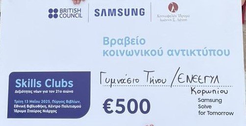 Η ομάδα μας απέσπασε ένα από τα τέσσερα βραβεία, το Βραβείου Κοινωνικού Αντικτύπου. Την εκδήλωση προλόγισαν η Διευθύντρια του Βρετανικού Συμβουλίου, η Γενική Διευθύντρια του Ιδρύματος Ιωάννη Σ. Λάτση και ο CEO της Samsung Electronics Greece, ενώ την κριτική  επιτροπή αποτελούσαν εκπρόσωποι της Εκπαιδευτικής Ραδιοτηλεόρασης του Υπουργείου Παιδείας, της WWFΕλλάς και της Samsung.
