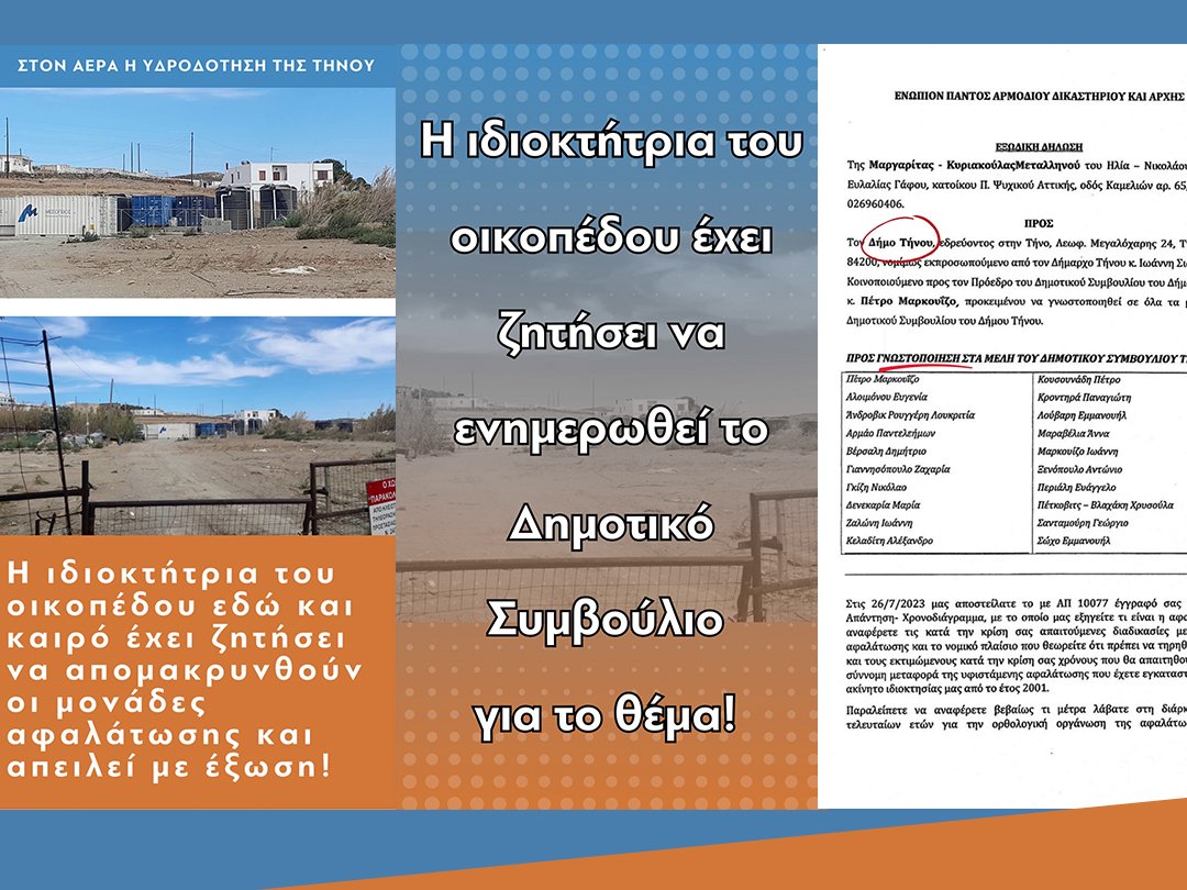 Η ιδιοκτήτρια του εν λόγω οικοπέδου  (όπως θα δείτε στα έγγραφα που αποκαλύπτουμε) έχει ζητήσει να απομακρυνθούν οι μονάδες αφαλάτωσης καθώς δεν υπάρχει καμία συμφωνία, αλλά ο κ. Σιώτος αν και είχε υποσχεθεί ότι θα το πράξει όχι μόνο δεν τις απομάκρυνε αλλά τοποθέτησε και τη νέα μισθωμένη μονάδα στον ίδιο χώρο.