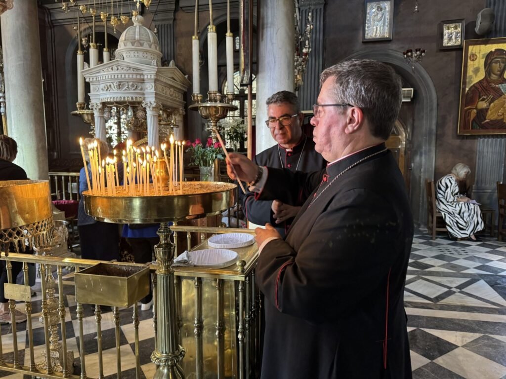 Η ζωή μας είναι ένα συνεχές προσκύνημα, ένα ταξίδι προς την επουράνια Πατρίδα. Στη διάρκεια της  πορείας συμβαίνουν πολλά, όχι πάντα καλά, μερικές φορές πέφτεις, αμφιβάλλεις, θυμώνεις. Στην πορεία μας φτάσαμε εδώ σήμερα, στο σπίτι της Παναγίας, για να λάβουμε τη μητρική της βοήθεια, να ακούσουμε την πρόσκλησή της: κάνετε ό,τι κι αν σας πει ο Υιός μου. Ο Ιησούς μας λέει: Ειρήνη μαζί σας! Είμαστε λοιπόν εδώ για να λάβουμε την ειρήνη του Κυρίου. Αλλά και εμείς είμαστε σταλμένοι, όπως οι Απόστολοι, να φέρουμε αυτή την ειρήνη στον κόσμο. Γνωρίζουμε καλά πόσο πολύ χρειάζεται ο κόσμος μας την ειρήνη. Όχι μόνο στην Ουκρανία, στους Αγίους Τόπους και σε άλλες χώρες. Όλοι εμείς χρειαζόμαστε την ειρήνη, στις καρδιές μας, στις οικογένειές μας, στην ελληνική μας κοινωνία. Στην προσκυνηματική μας πορεία ας φέρουμε μαζί μας την ειρήνη του Χριστού σε όλους.