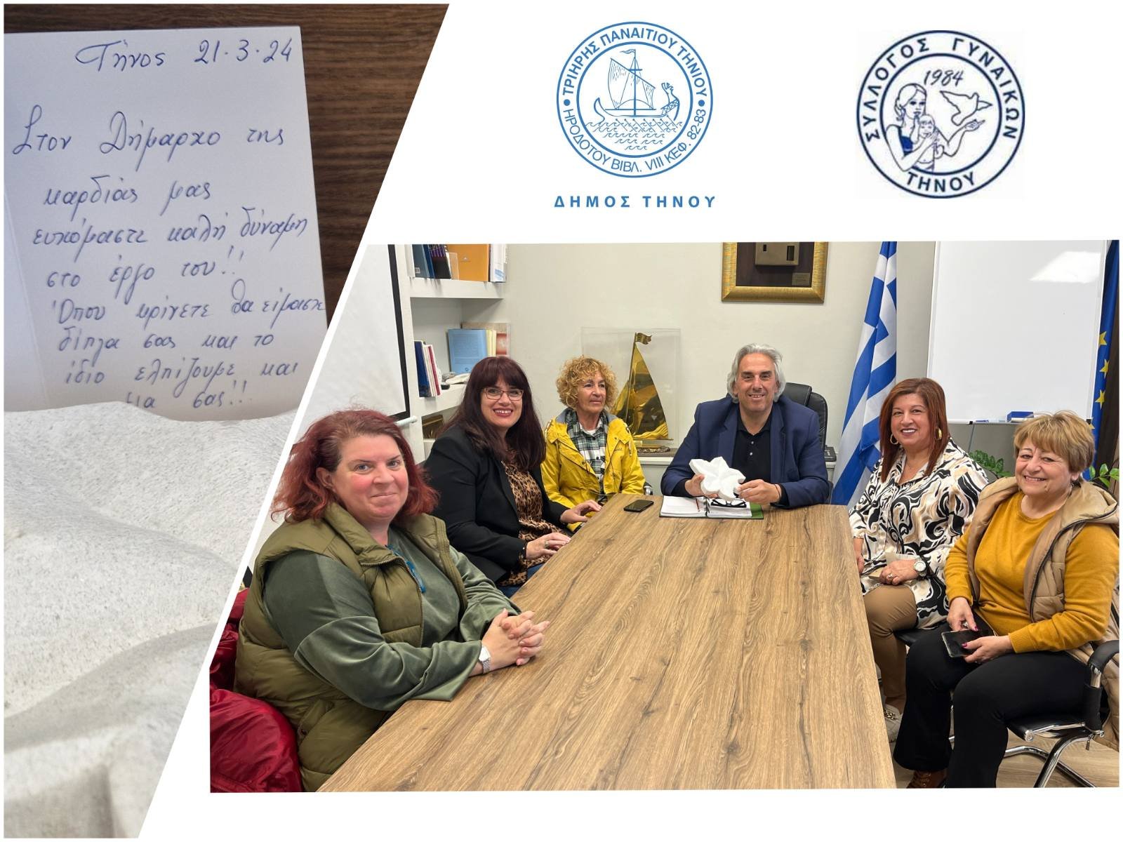 Τον Δήμαρχο Τήνου Παναγιώτης Κροντηρά επισκέφτηκαν η πρόεδρος και τα μέλη του Σύλλογος Γυναικών Τήνου. Στη συνάντηση που είχαμε, δεσμευτήκαμε να συνεργαστούμε στενά με τον Σύλλογο και να του παράσχουμε κάθε δυνατή υποστήριξη.