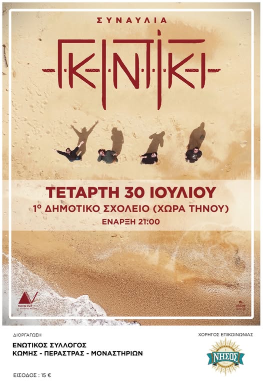 Ο Ενωτικός Σύλλογος Κώμης – Περάστρας – Μοναστηρίων με μεγάλη χαρά, την Τετάρτη 30 Ιουλίου και ώρα 21:00, διοργανώνει συναυλία στο 1ο Δημοτικό Σχολείο (Χώρα Τήνου) με το μουσικό σχήμα ”Γκιντίκι”. Θα χαρούμε πολύ να σας έχουμε κοντά μας και να χορέψουμε όλοι μαζί σαν μια μεγάλη παρέα.