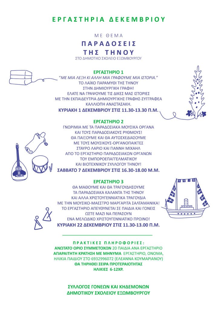 Ελάτε να γνωρίσουμε τις παραδόσεις του νησιού μας μέσα από το λαϊκό παραμύθι, τη παραδοσιακή μουσική και τα παραδοσιακά κάλαντα της Τήνου!