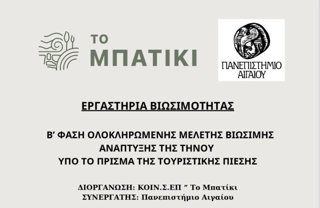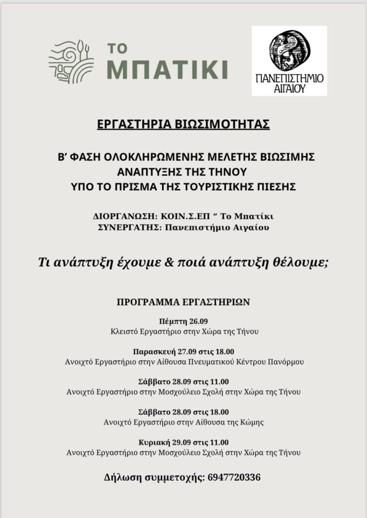 Ξεκινά η Β’ Φάση Ολοκληρωμένης Μελέτης Βιώσιμης Ανάπτυξης της Τήνου υπό το πρίσμα της τουριστικής πίεσης, με τη διοργάνωση σειράς εργαστηρίων. Το πρόγραμμα αυτό διοργανώνεται από την Κοιν.Σ.Επ. “Το Μπατίκι”, σε συνεργασία με το Πανεπιστήμιο Αιγαίου.