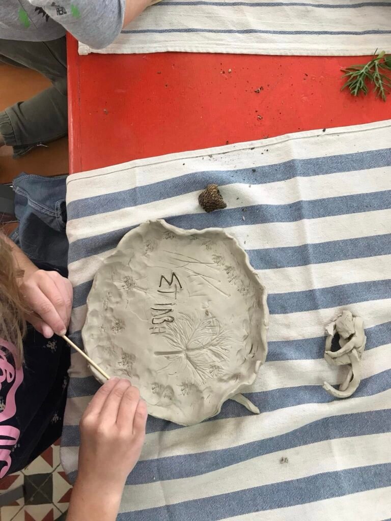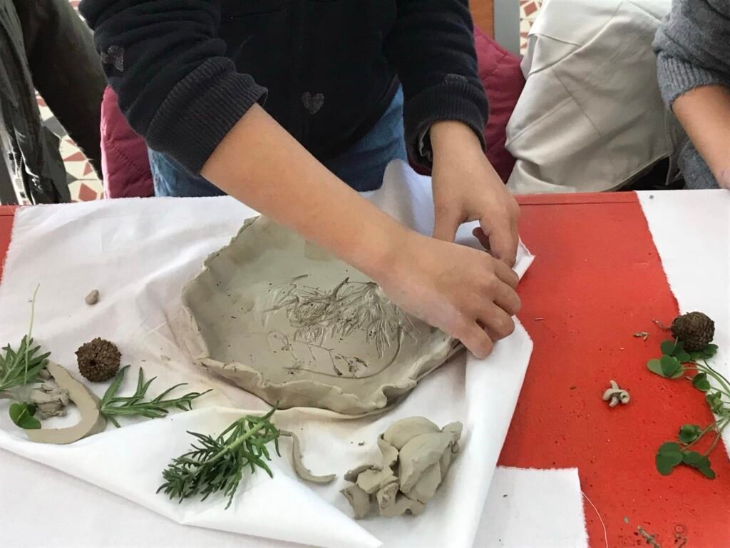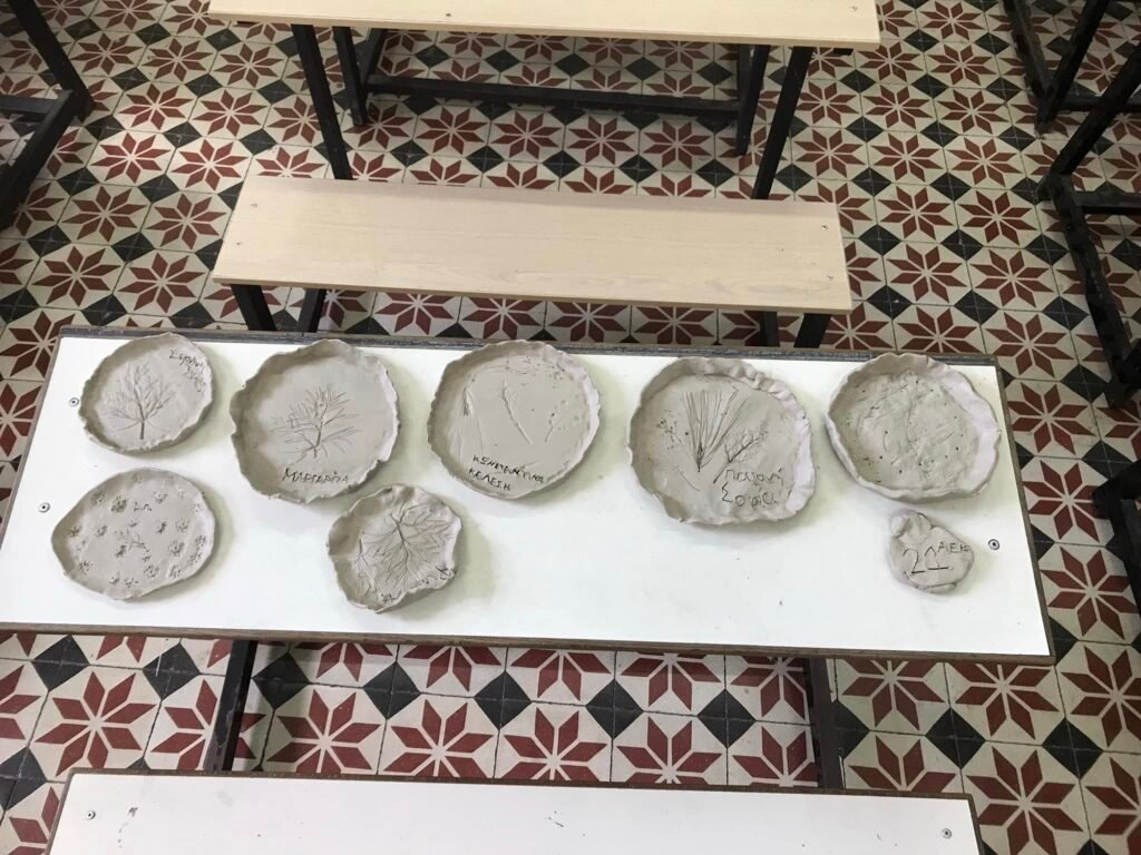 Μετά από μια σύντομη είσαγωγή για την προέλευση και τα χαρακτηριστικά του πηλού, καθώς και την εξέλιξη της κεραμικής από την προϊστορική εποχή, οι μικροί καλλιτέχνες επιστράτευσαν τη φαντασία και τη δημιουργικότητά τους και κατασκεύασαν πήλινα πιάτα και κούπες, διακοσμημένα με αποτυπώματα φυτών ή δικά τους σχέδια. Περήφανοι για τα έργα τους, ανυπομονούν να τα στεγνώσουν για να τα πάρουν στα χέρια τους!!