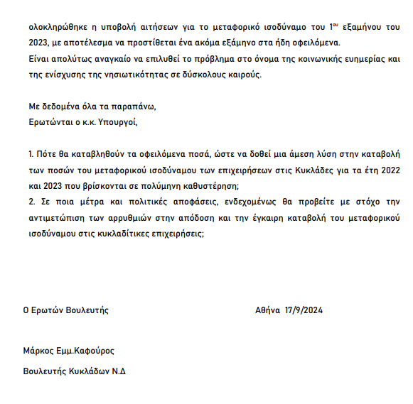 Ο βουλευτής Κυκλάδων ρωτά τους αρμόδιους υπουργούς:
