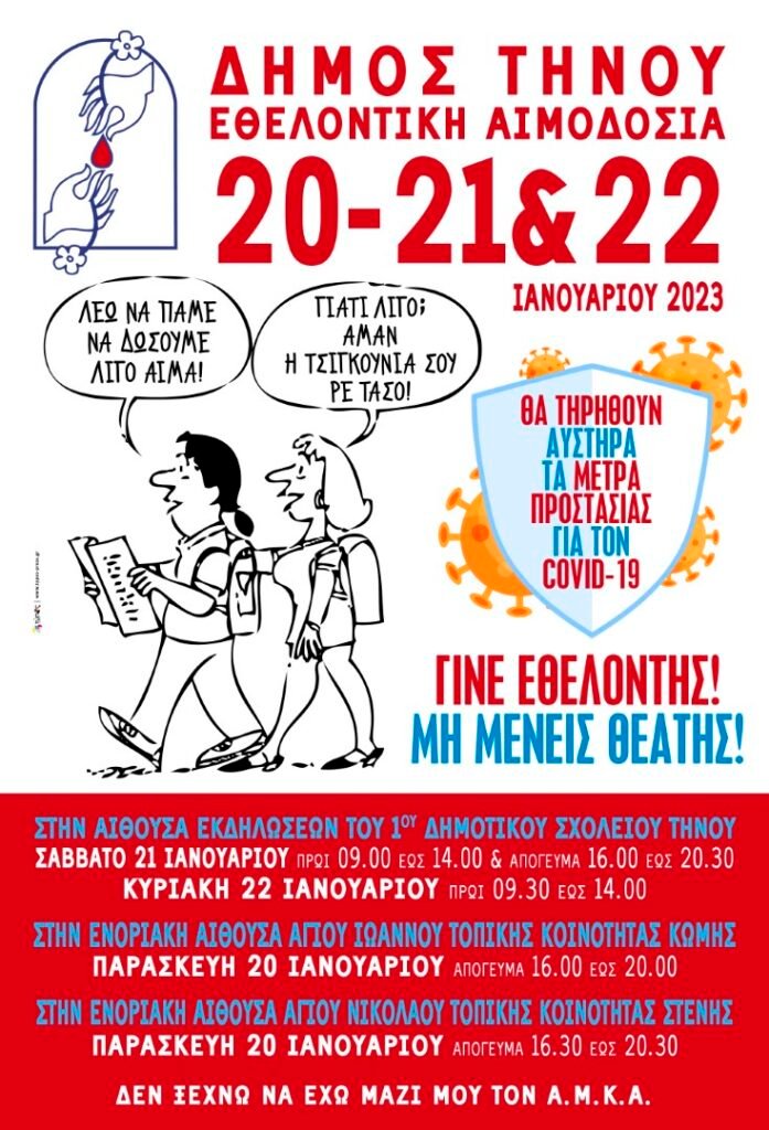 Ο ΔΗΜΟΣ ΤΗΝΟΥ διοργανώνει σε συνεργασία με το Κλιμάκιο Αιμοδοσίας του Νοσοκομείου Παίδων «ΑΓΙΑ ΣΟΦΙΑ» την 47η Εθελοντική Αιμοδοσία, εις μνήμην Νικολάου Ελ. Κορνάρου, τ. Δημάρχου Τήνου.