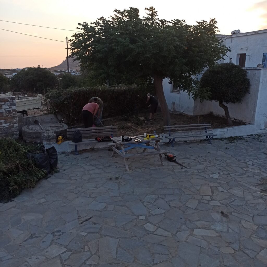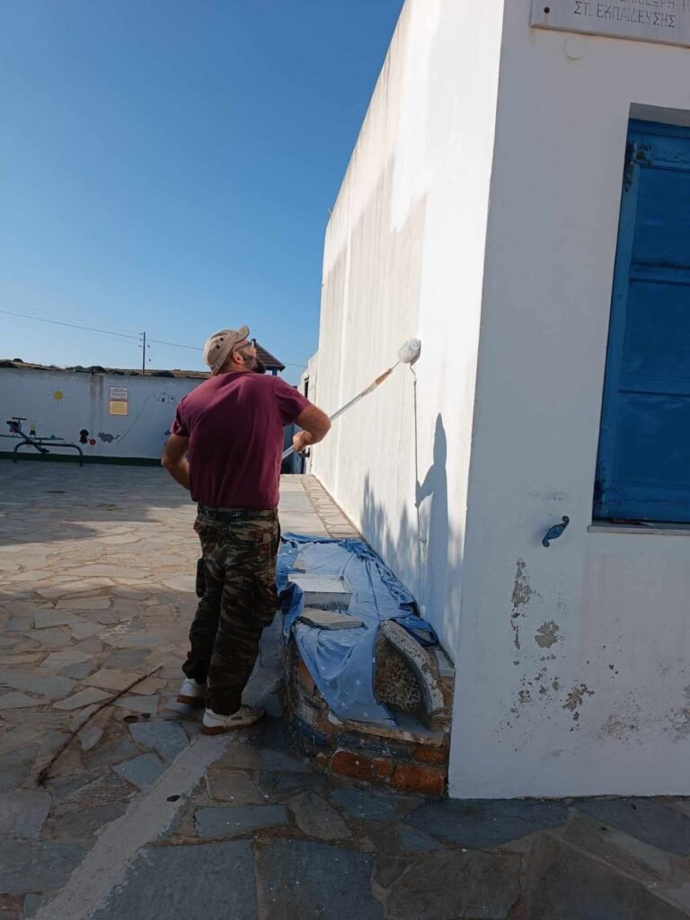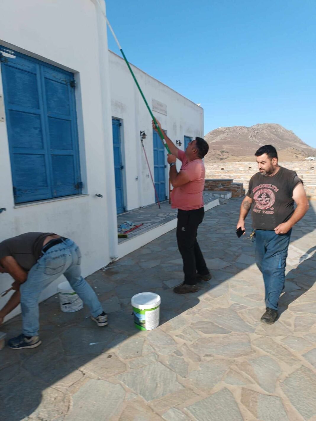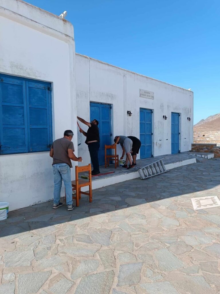 Έπρεπε να βαφτεί εξωτερικά η αίθουσα, να καθαριστεί ο περιβάλλον χώρος του, να κλαδευτουν οι πικροδάφνες στον δρόμο του Αγίου Αντωνίου, να καθαριστεί ο χώρος στο ηρώο. Οι εθελοντές, οι φύλακες του χωριού, αυτοί που υπάρχουν σε κάθε χωριό του νησιού, πήραν τα εργαλεία τους και για μια ακόμα φορά τα κατάφεραν.
